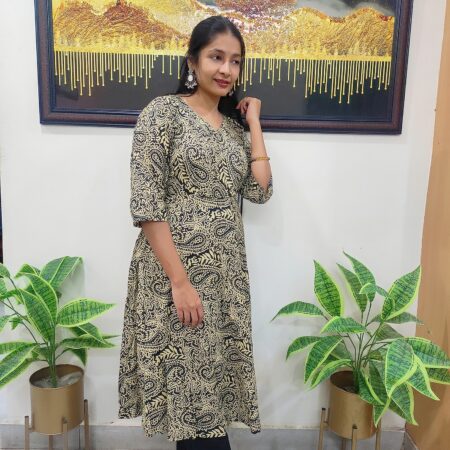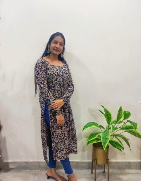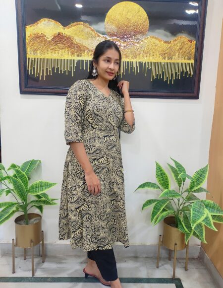 Elegant Black Kalamkari Frilled Kurta with Hand Block Print