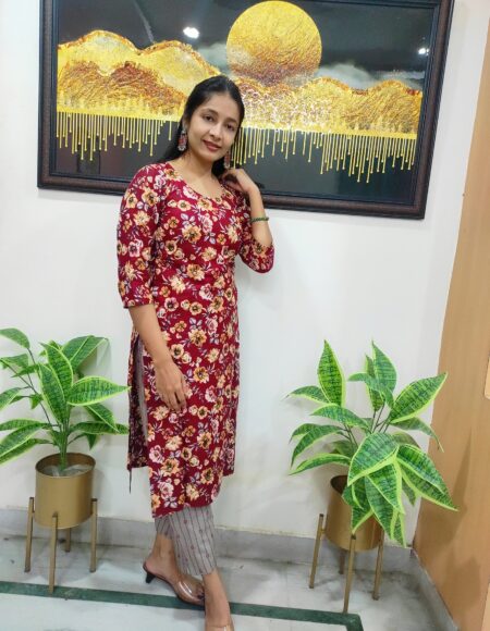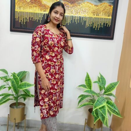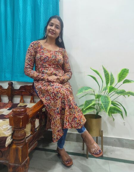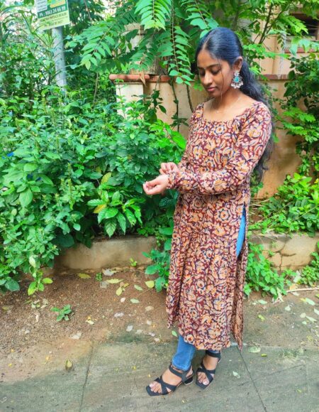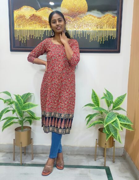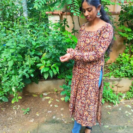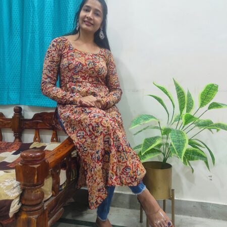 Elegant Meroon Kalamkari Frilled Kurta with Hand Block Print