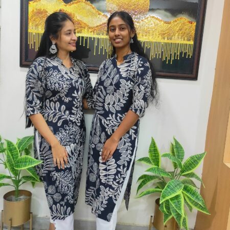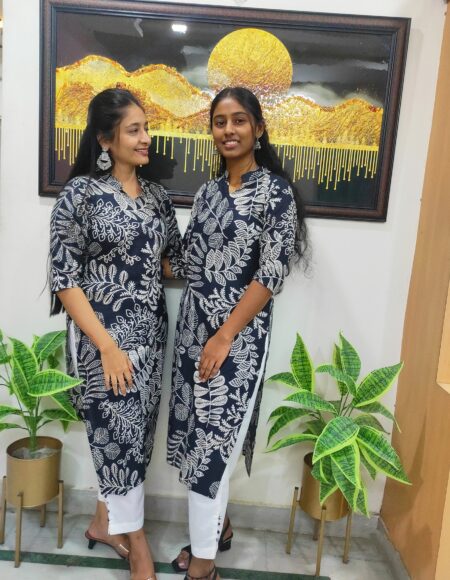 Embrace The New Black and White Leaf Print Collar Neck Kurta with Pant