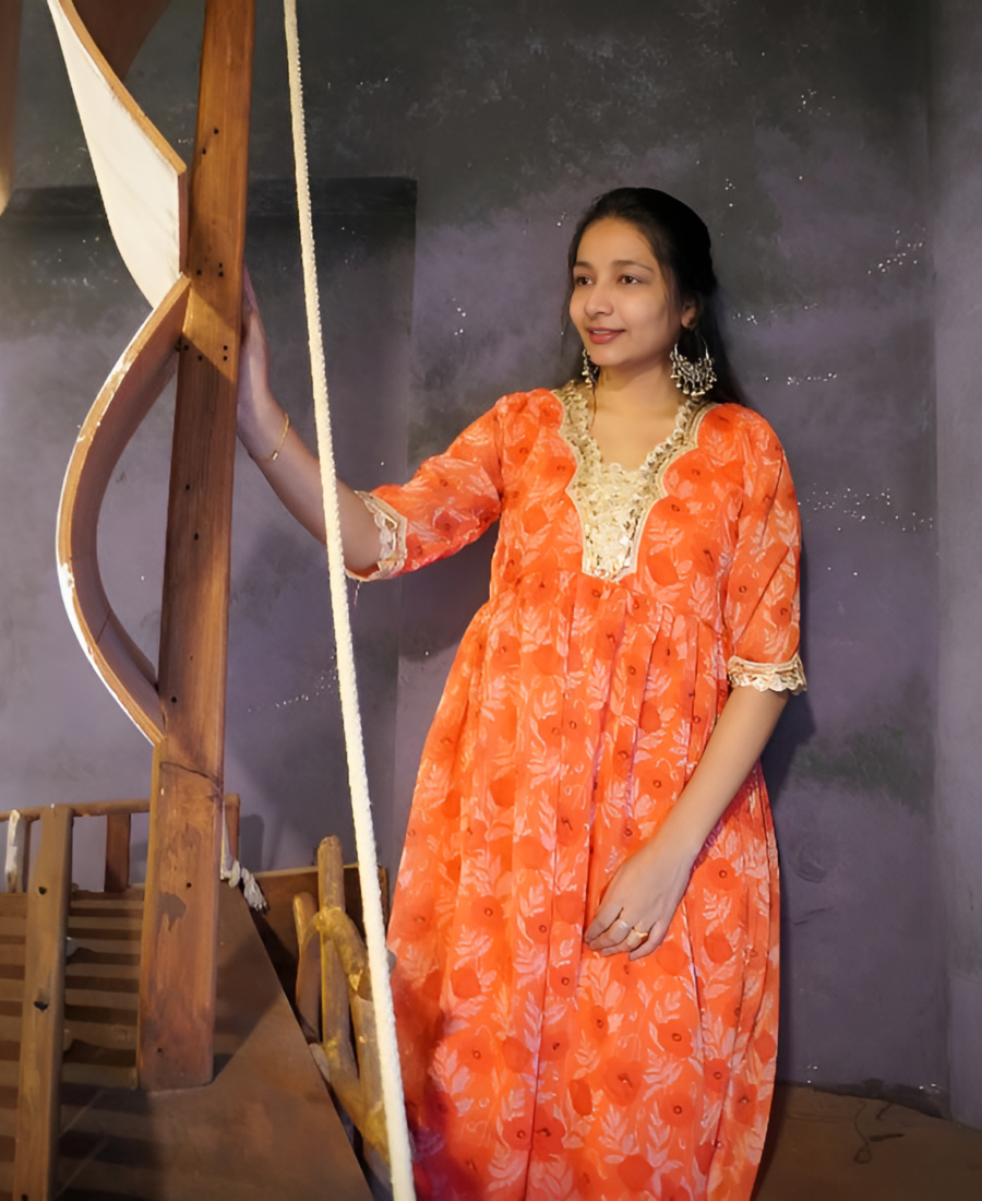 orange muslin heavy lace stitched umbrella kurta