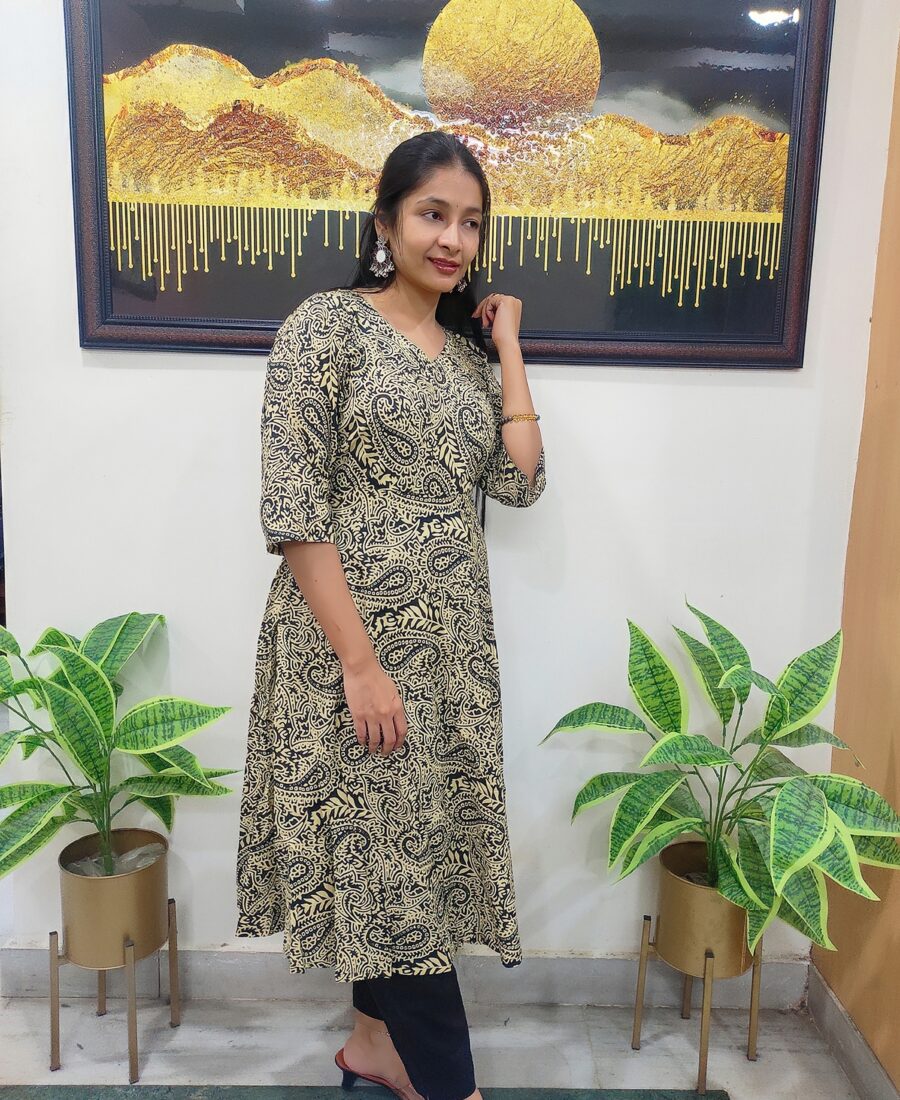 Elegant Black Kalamkari Frilled Kurta with Hand Block Print