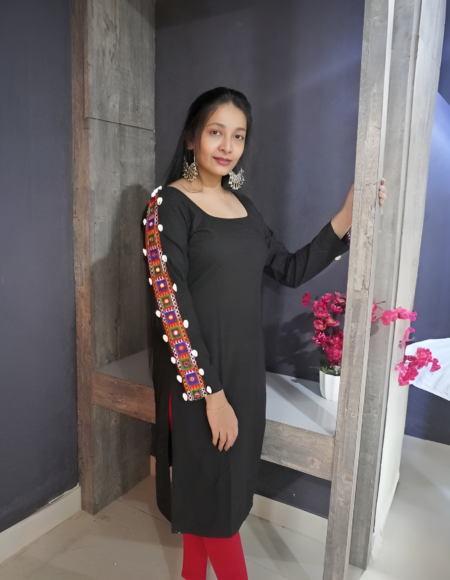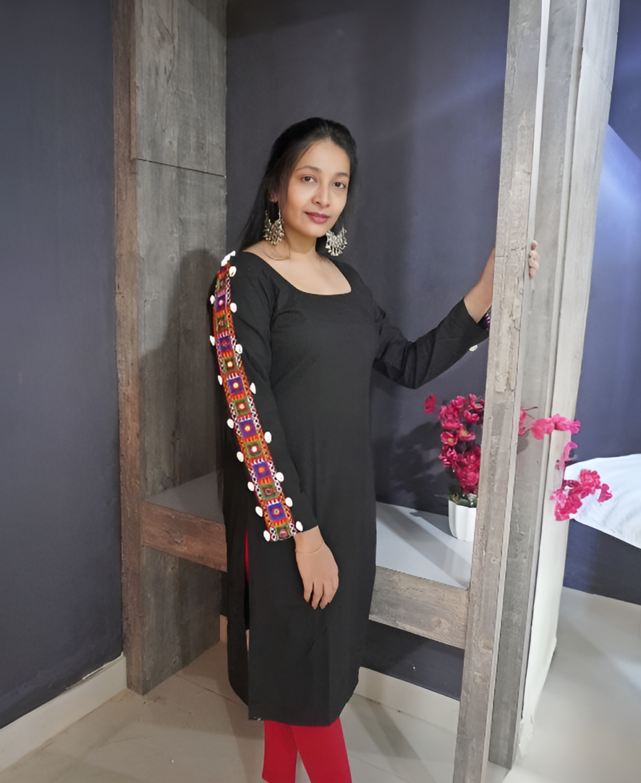 Black Multicolor Lace-Stitched Kurta with Shell Embroidery