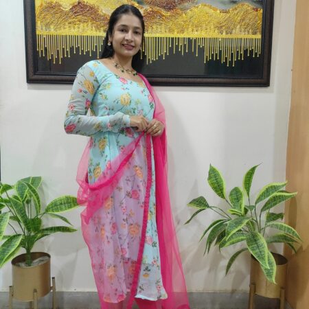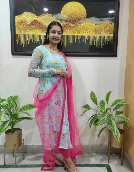 Blooming Light Blue Floral Print Anarkali with Duppatta