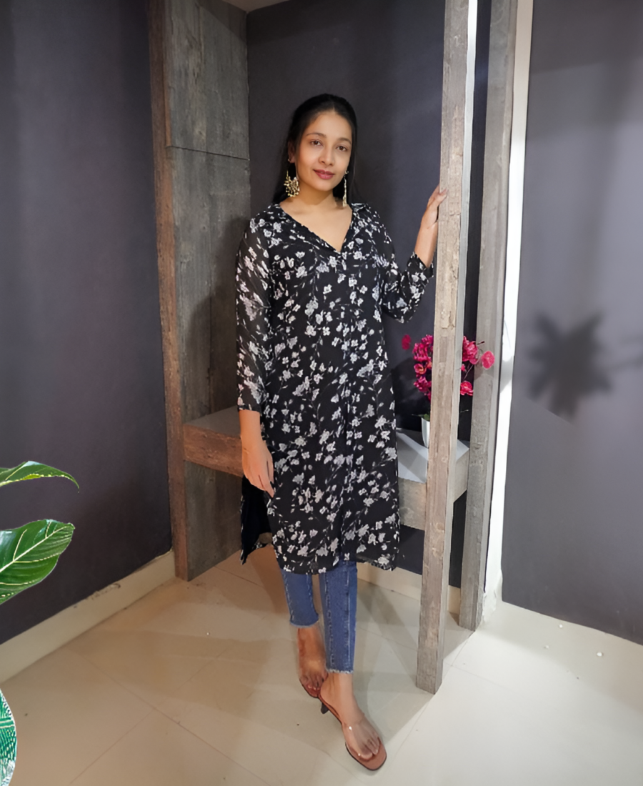 Black and Red Multicolour Cotton Full Sleeves Kurti