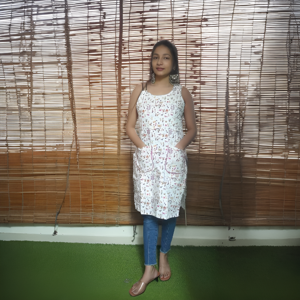 "Showcase playful charm with the Artistic White Doll Imprint Kurta—a perfect pick for casual outings, creative events, or everyday style with a twist. Pair it with vibrant straight pants or denim for a pop of color, and accessorize with quirky earrings or handmade jewelry. Add a crossbody sling or tote bag, and complete the look with comfortable kolhapuris or sneakers. Keep your hair in a messy bun or braided ponytail, and go for fresh makeup with a hint of kajal and a tinted lip balm for a youthful, artsy vibe."