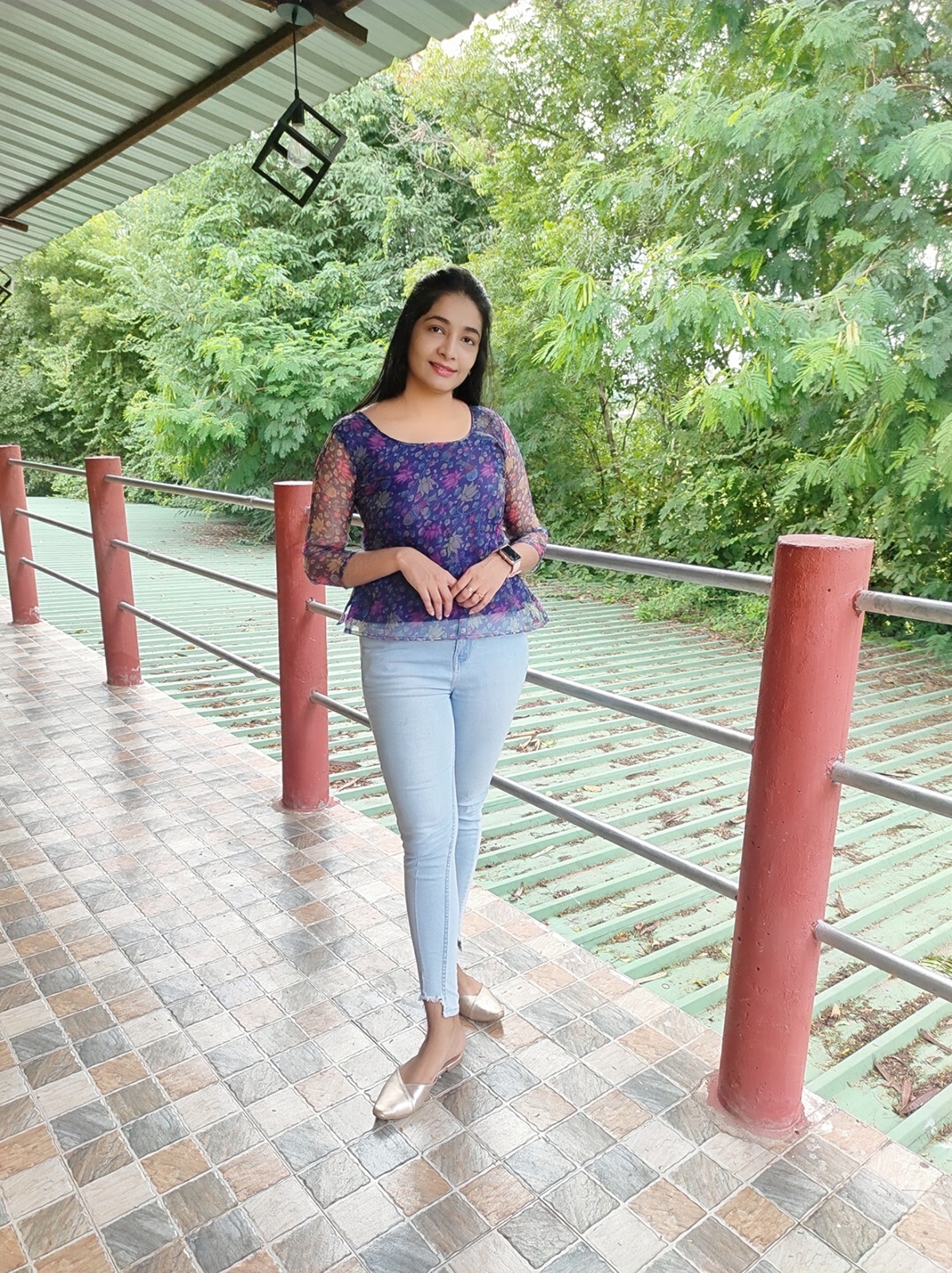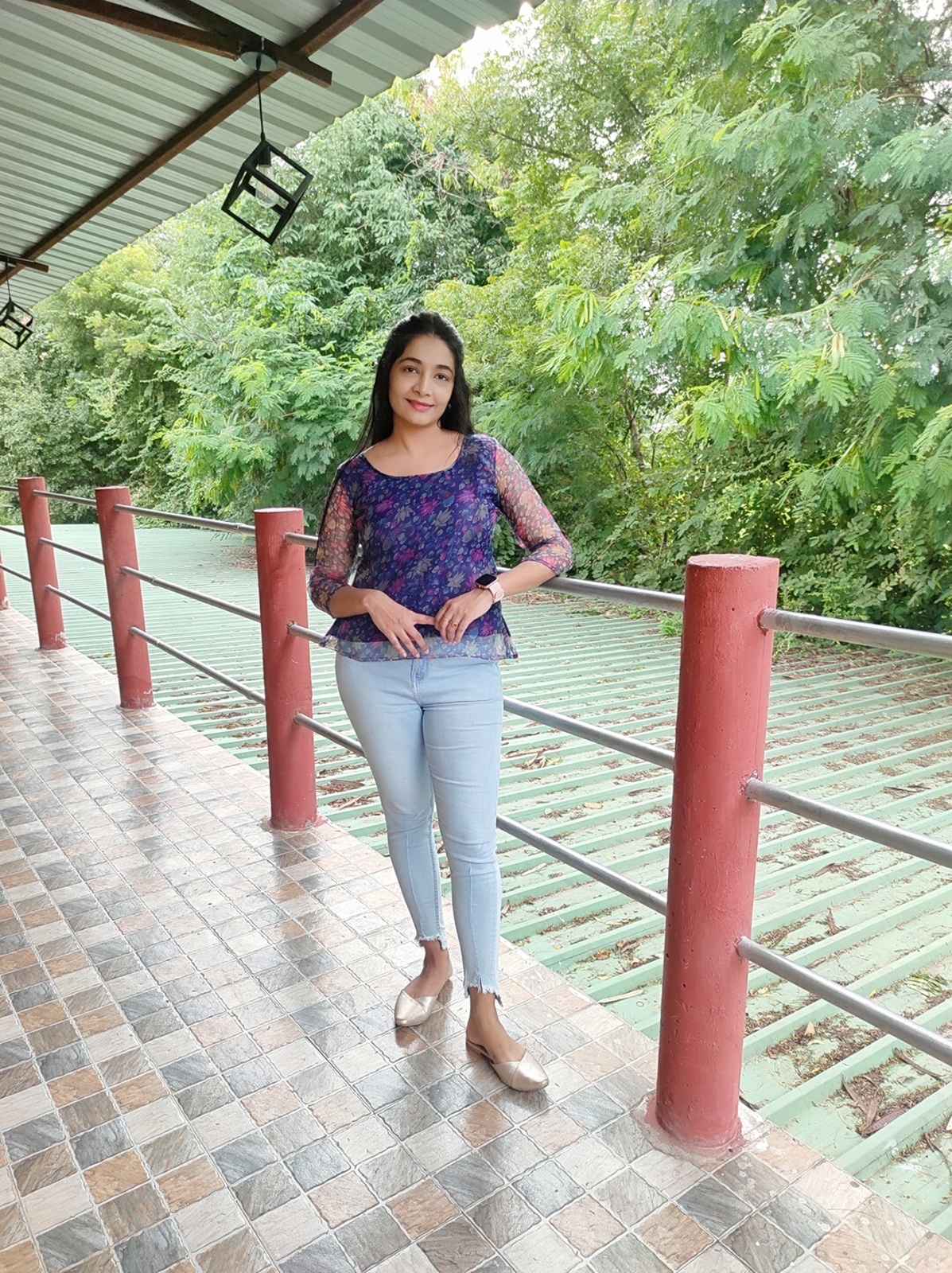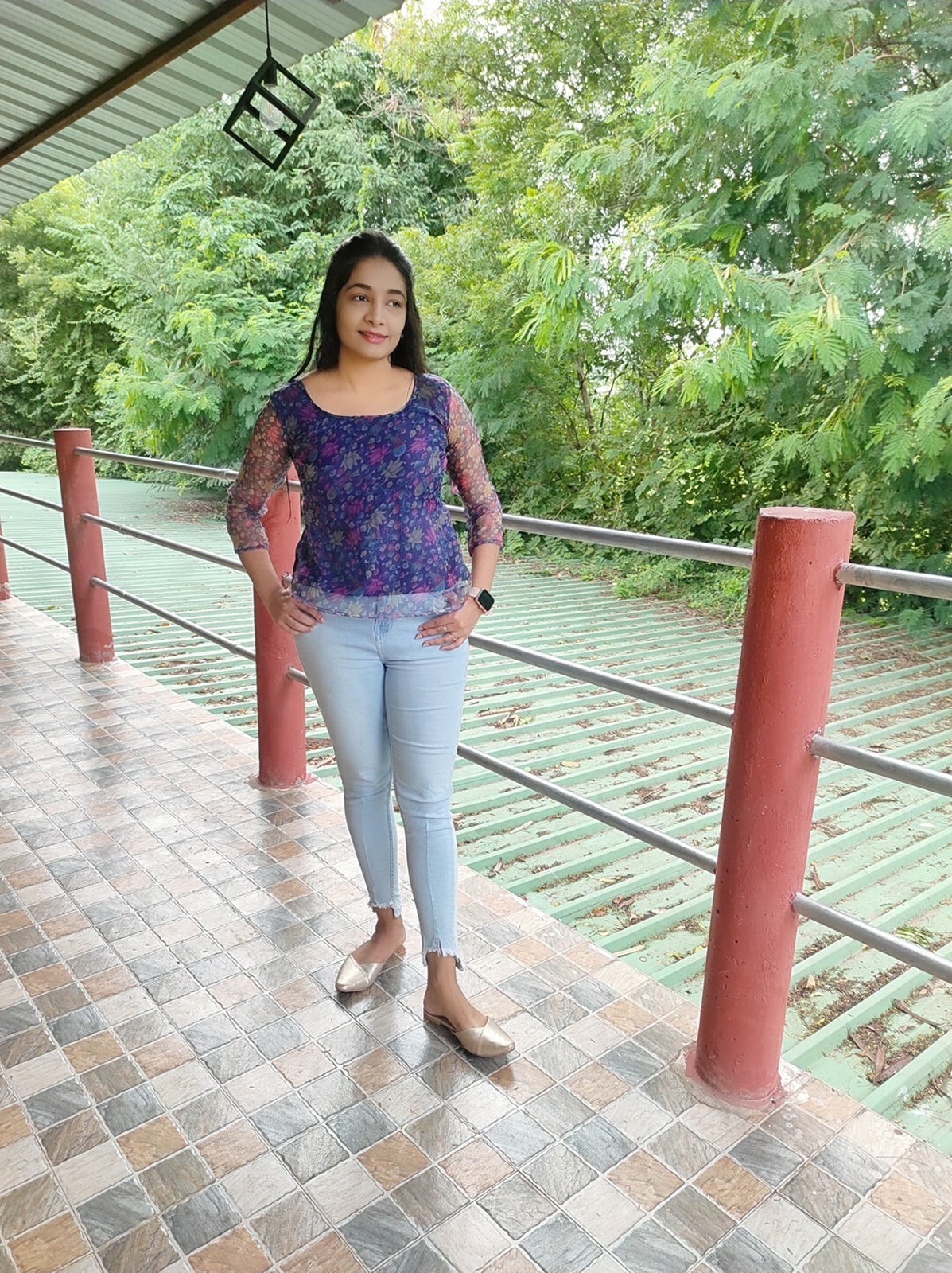 "Channel soft sophistication in the Azure Bloom Organza Blue Top—perfect for brunches, evening soirees, or festive gatherings. Pair it with high-waisted white trousers, or Straight and Flared Pants.