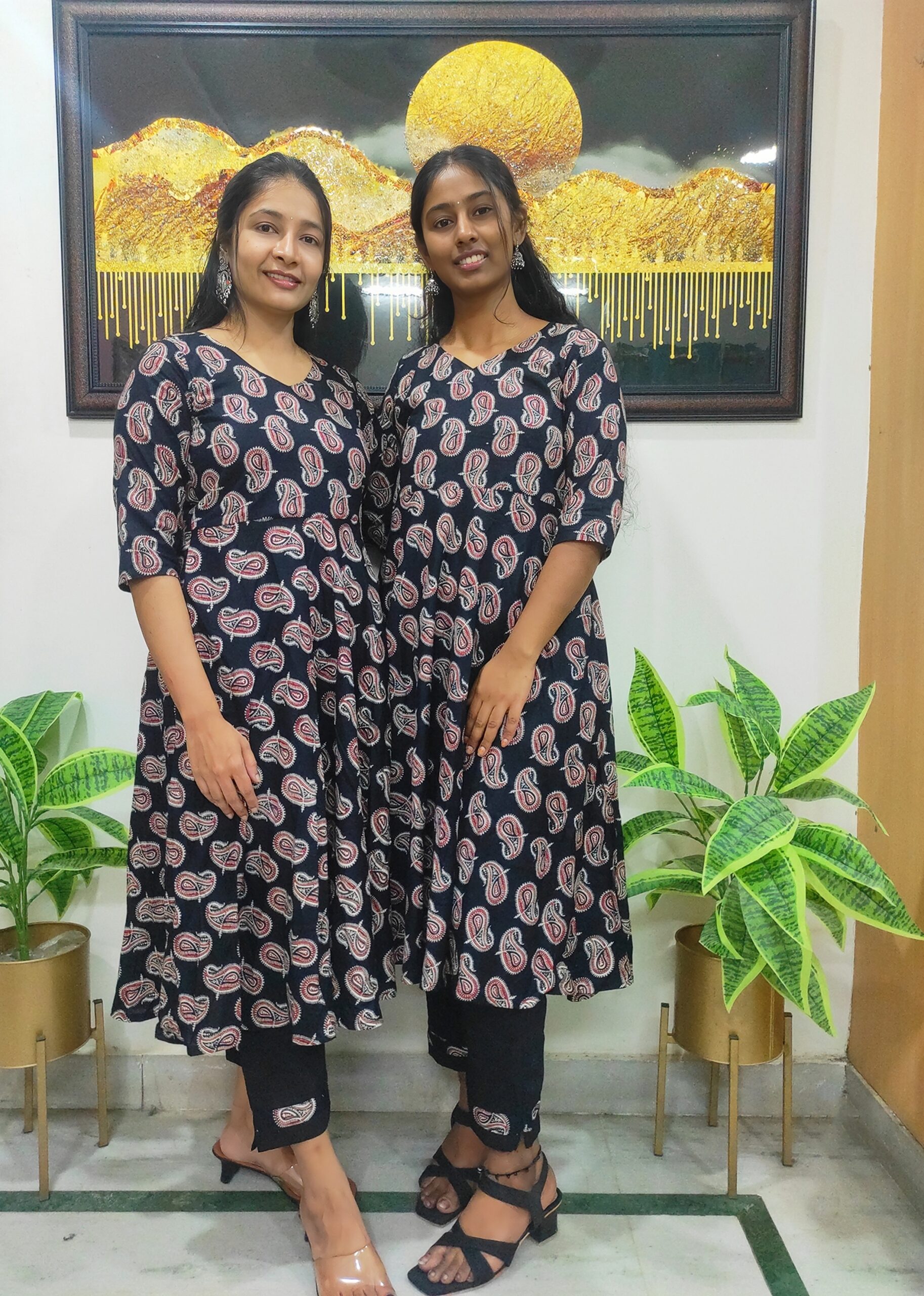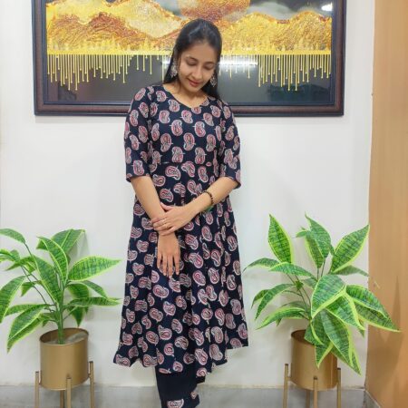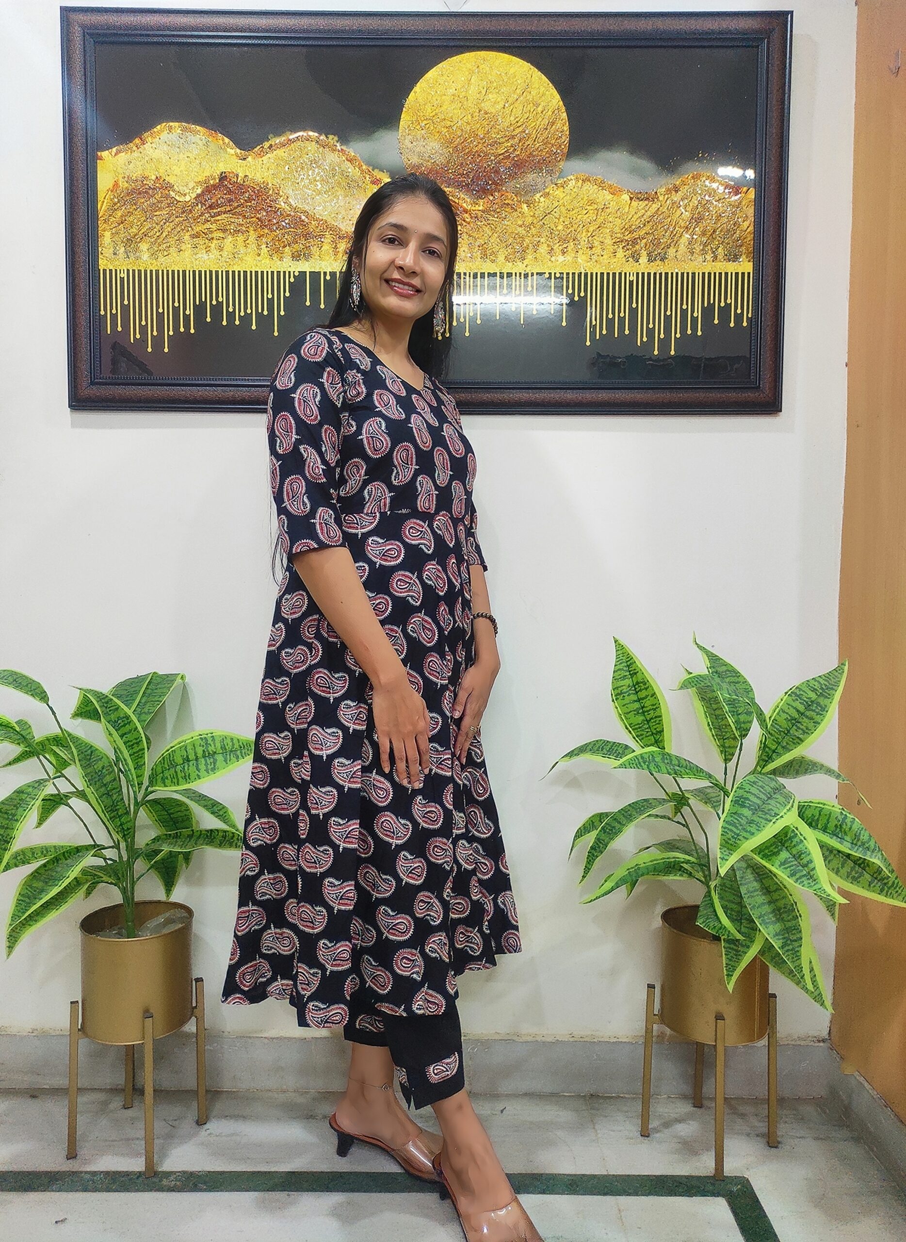 Radiate charm in this striking Anarkali, featuring a black and red multicolour palette with traditional mango print motifs that add a vibrant, ethnic touch. The flowing silhouette is designed for both grace and comfort, making it ideal for festive gatherings or elevated casual wear. It is beautifully paired with a matching border-stitched pant that enhances the overall look with subtle detailing. The combination of bold colors and classic prints makes this ensemble a standout choice for any occasion.