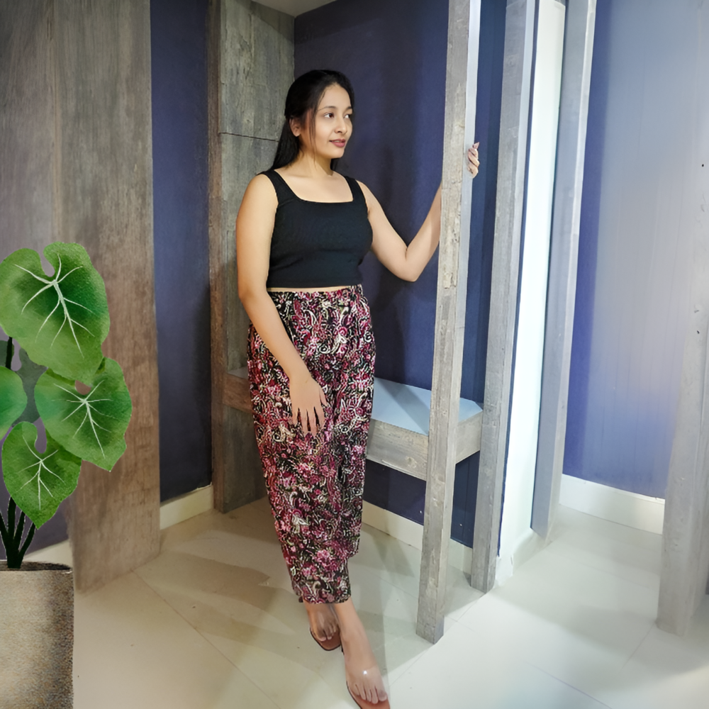 "Add a pop of personality with a black multicolour patterned shrug and pant set. Pair it with a solid tank or crop top in a matching tone, and accessorize with hoop earrings, layered bracelets, and slip-on sandals or block heels. Opt for a high ponytail or relaxed waves, and finish the look with bold eyeliner and a tinted lip for a chic, fuss-free ensemble perfect for day outings or casual get-togethers."