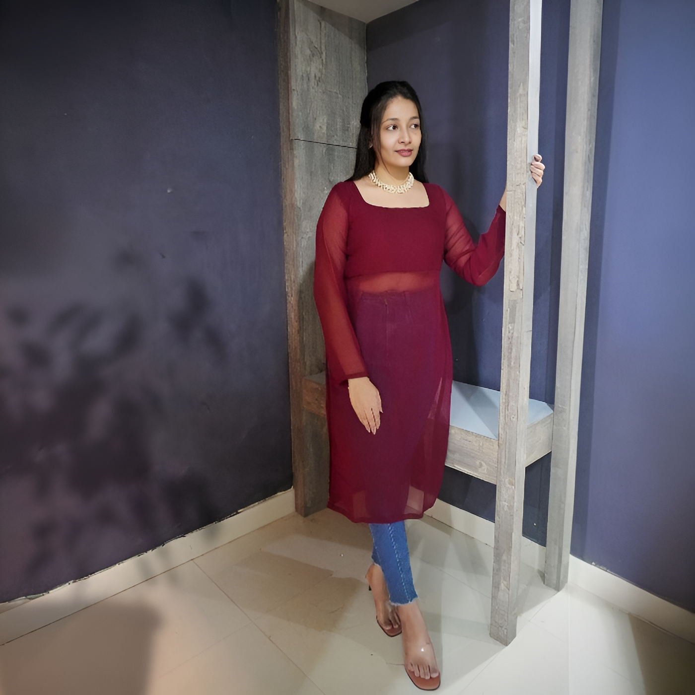 "Make an elegant statement in a chic maroon georgette kurta, perfect for both festive occasions and evening outings. Pair it with straight Jeans pants orLoose fit pants, and embellished heels. Style your hair in a sleek low bun or soft curls, and complete the look with dewy makeup, winged eyeliner, and a bold maroon lip for a polished, sophisticated finish."