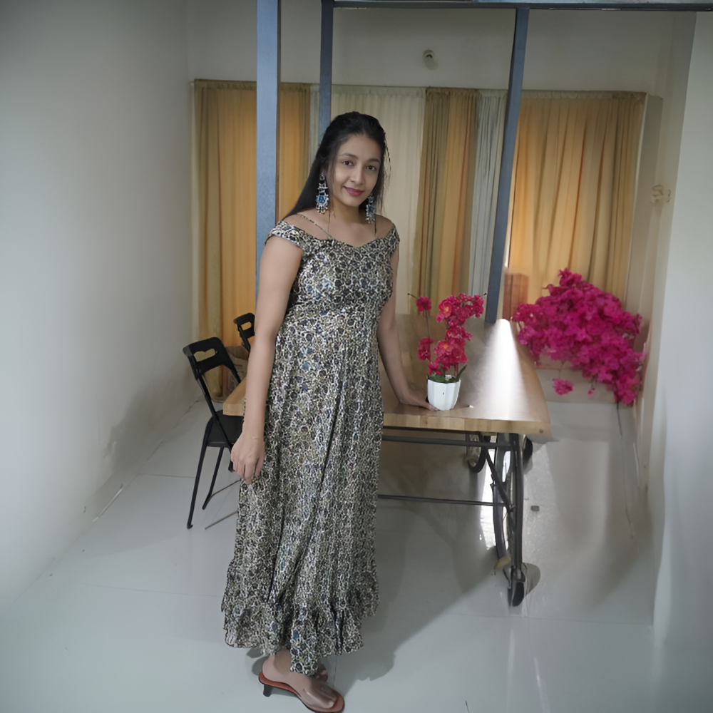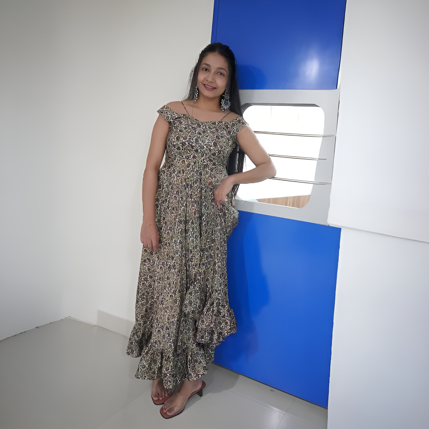"Step into effortless charm with a crepe multicolour frilled padded long frock. Pair it with statement earrings, a sleek clutch, and strappy heels to enhance its flowy silhouette. Opt for loose waves or a side braid, and complete the look with glowing skin, winged eyeliner, and a soft coral lip shade for a perfect day-to-evening ensemble."