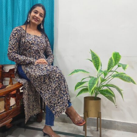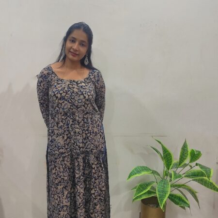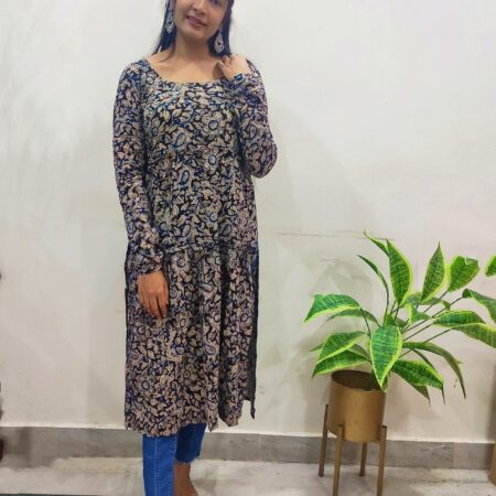 This Elegant Black Kalamkari Frilled Kurta showcases intricate hand block prints in traditional patterns, bringing timeless charm to a modern silhouette. The frilled hem adds a feminine touch, while the breathable fabric ensures all-day comfort. Perfect for casual gatherings or ethnic-inspired looks.