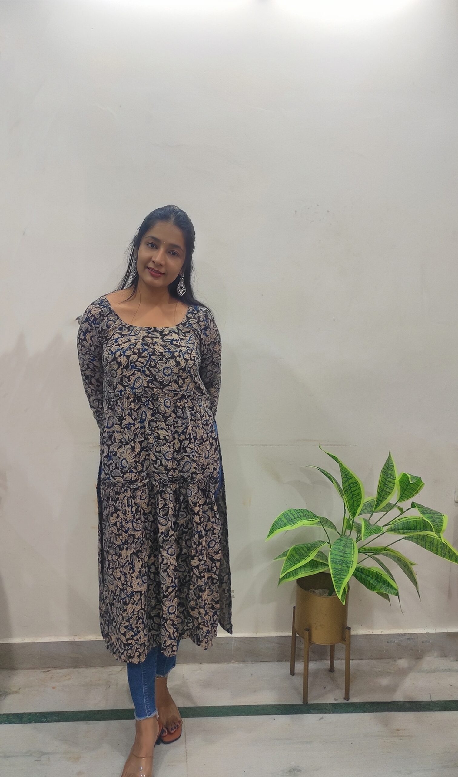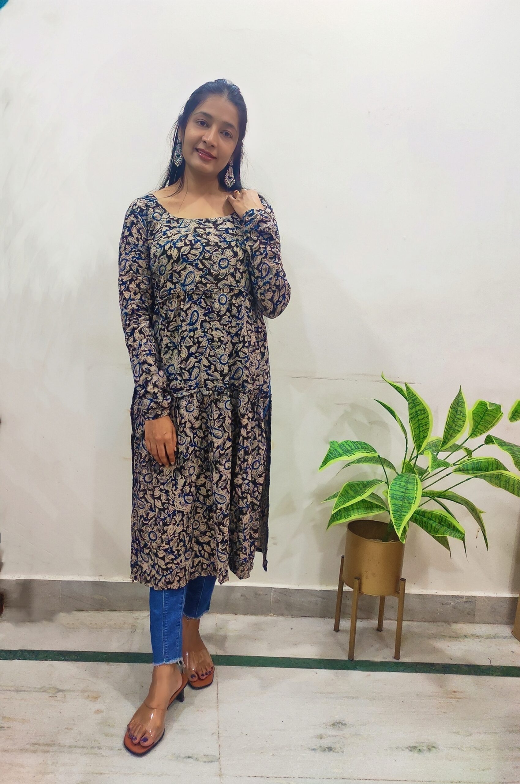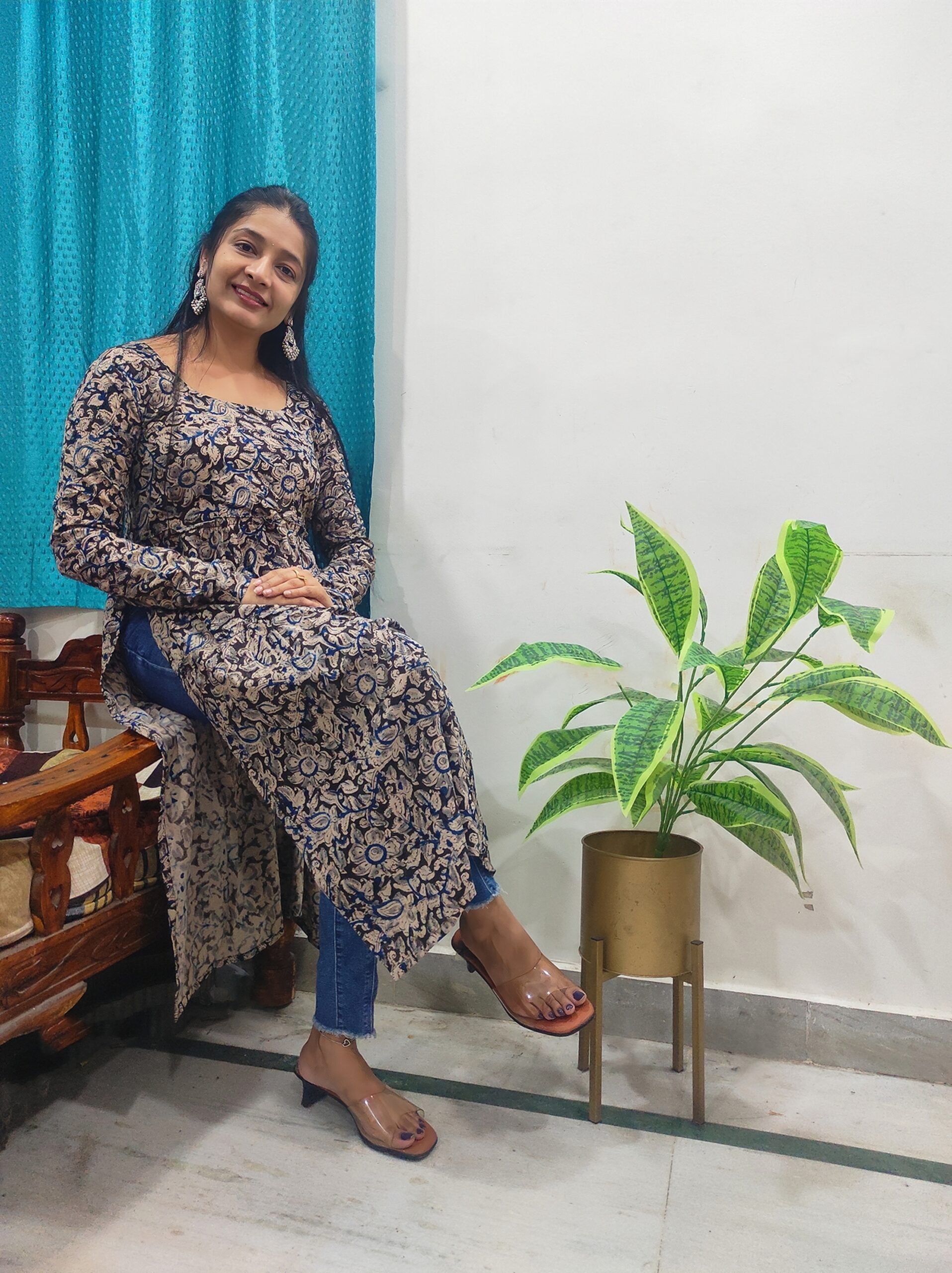 Pair this kurta with beige or off-white leggings or straight pants to let the print stand out. Add oxidized silver jewelry and juttis for a traditional touch, or go with minimal studs and sandals for a more casual, everyday look. A simple clutch or tote completes the outfit.