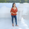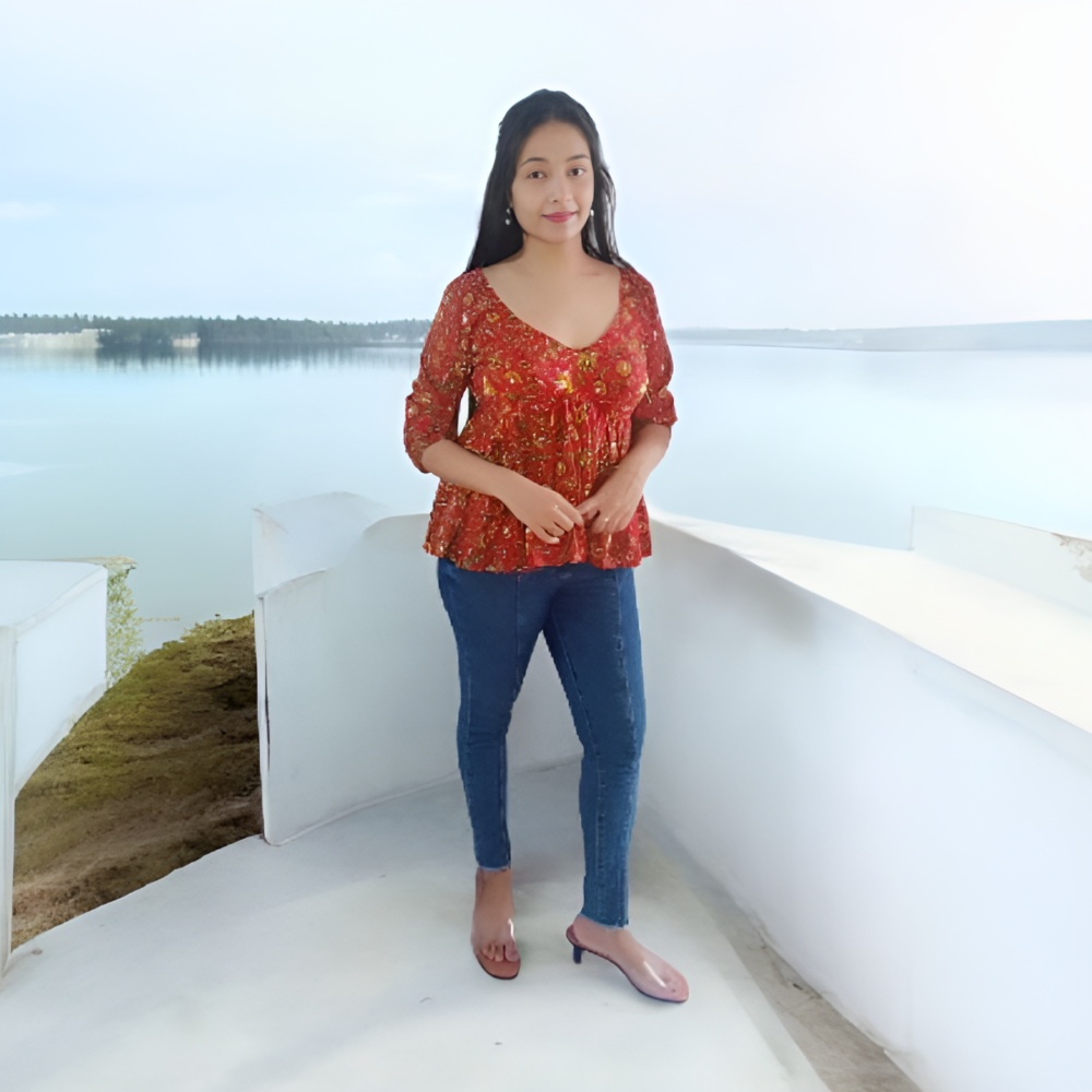 "Make a bold yet grounded style statement in a mud red printed padded peplum top. Pair it with high-waisted flared trousers or a solid skirt in neutral tones. Add statement hoops, a sling bag, and wedges or kolhapuris for a balanced Indo-western vibe. Complete the look with soft waves or a messy bun, subtle eyeliner, and a terracotta or nude lip for a confident and stylish finish."