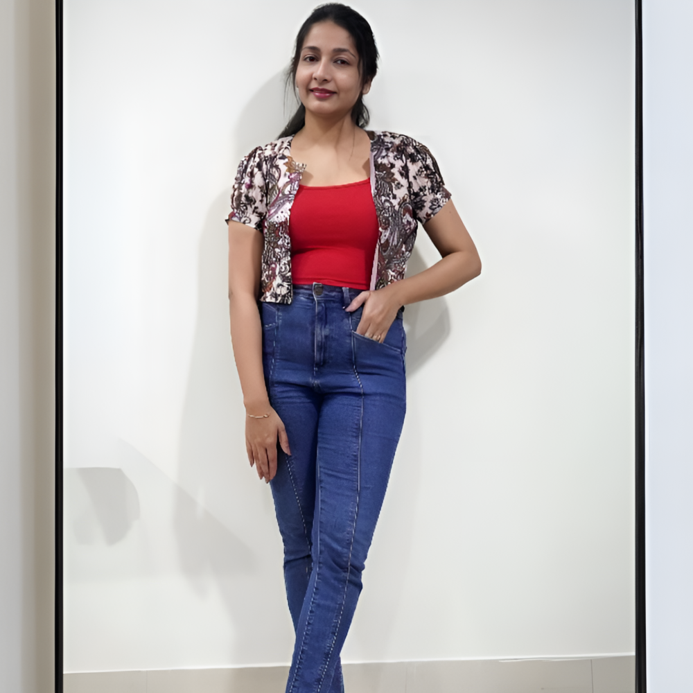 "Add a pop of personality with the Playful Fusion Print Short Shrug—perfect for layering over basics and giving your outfit an instant upgrade. Style it over a solid tank top, crop top, or fitted kurta, and pair with high-waisted jeans, dhoti pants, or flared trousers. Add funky earrings, boho bangles, and strappy flats or sneakers. Finish the look with a high ponytail or messy bun, and a touch of kajal with a tinted lip for a carefree, fusion-chic vibe."