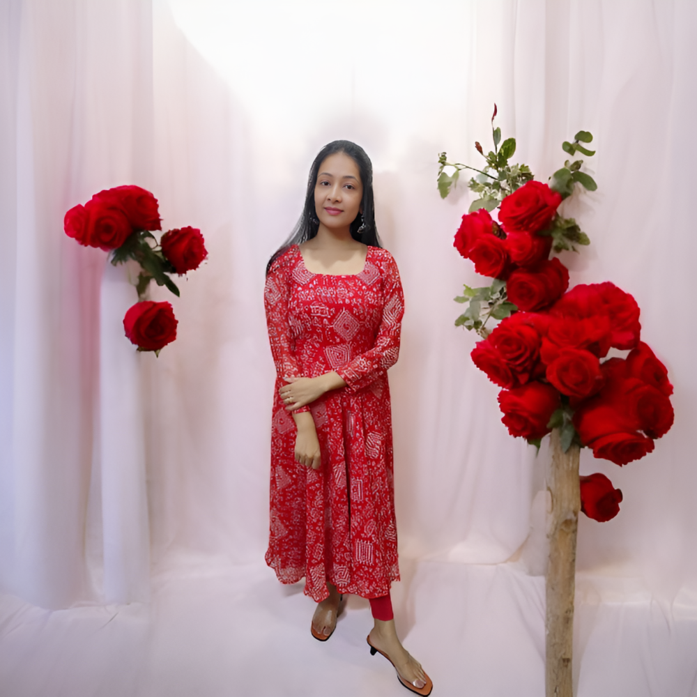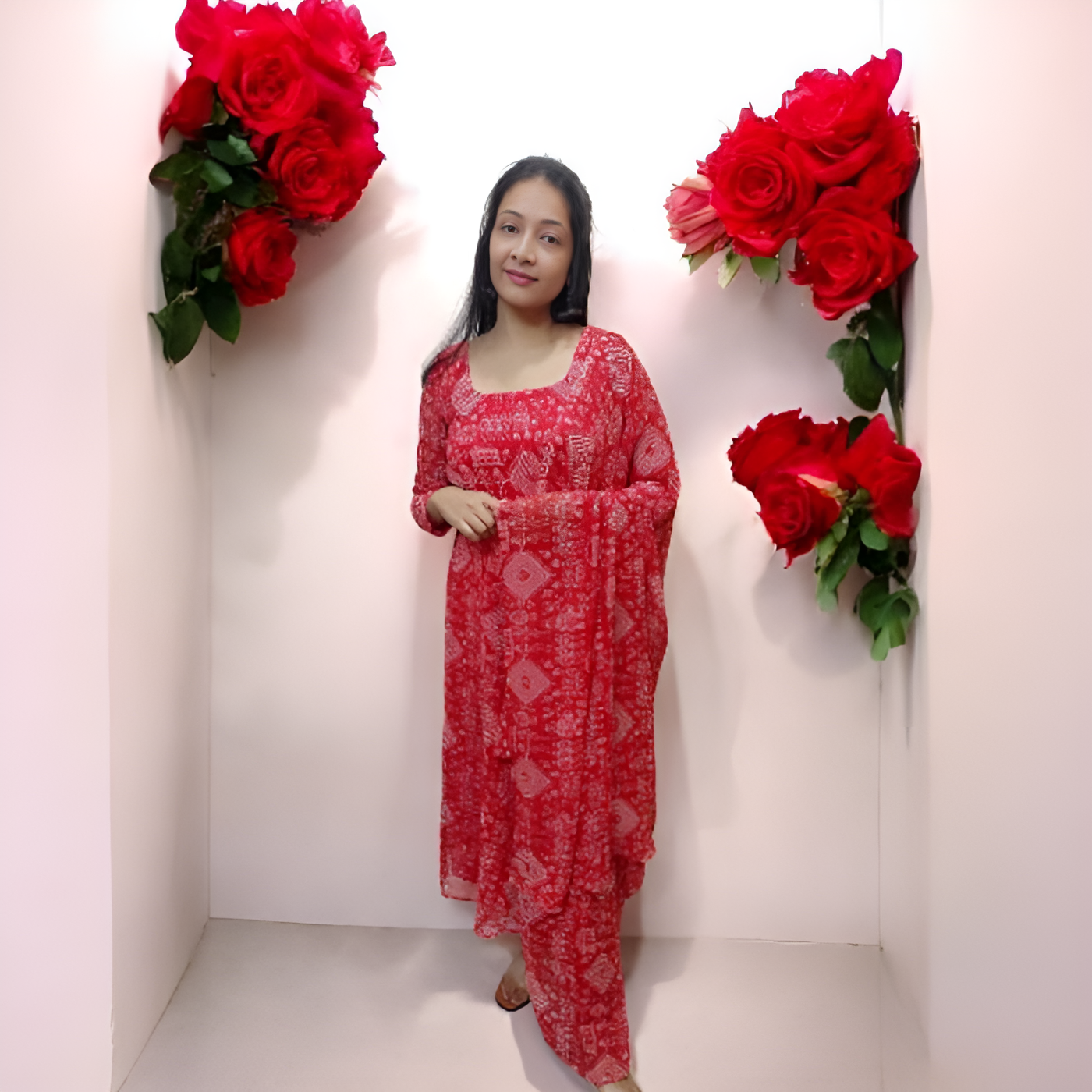 The Radiant Red Georgette Printed Kurta with Dupatta is a perfect blend of elegance and comfort. Its flowing fabric and intricate prints make it ideal for festive and casual outings.