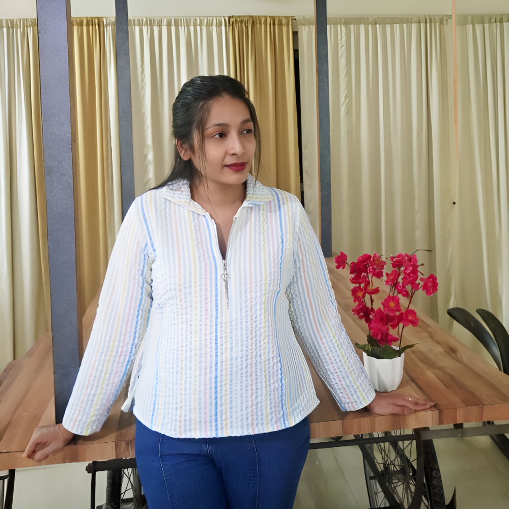 "Add a burst of color to your look with a rainbow crush zipper short top. Pair it with high-waisted jeans, denim shorts, or a solid mini skirt for a playful vibe. Complete the look with chunky sneakers or platform sandals, hoop earrings, and a sleek ponytail or half-up hairstyle. Go for a fresh makeup look with a pop of gloss and a hint of blush for that carefree, vibrant charm."