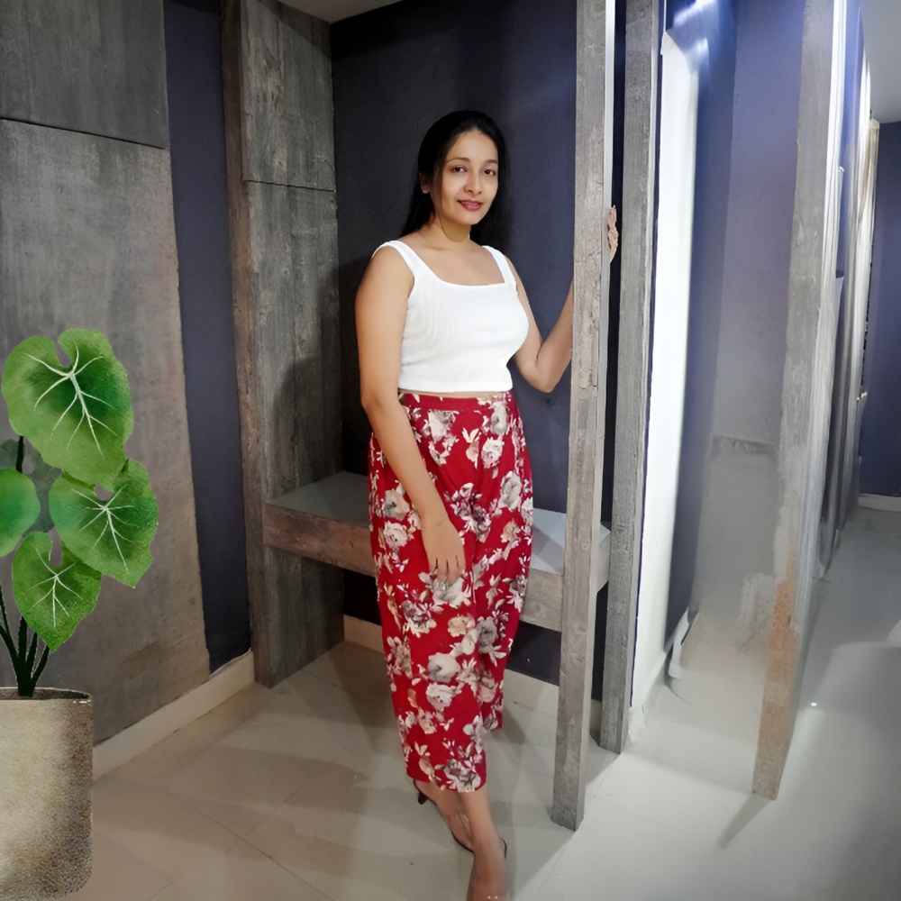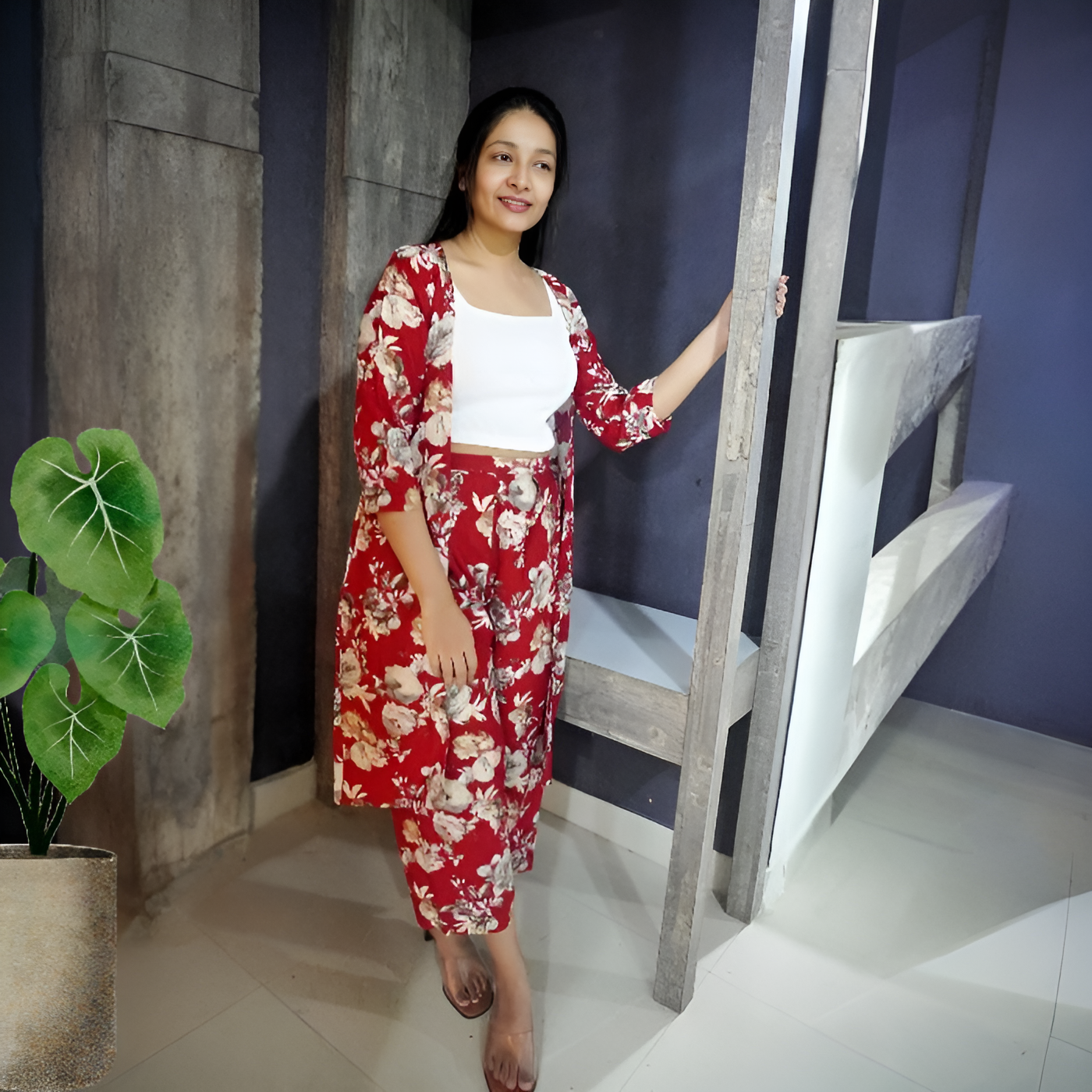 "Turn heads in a rayon red and white printed shrug and pant set, perfect for casual outings or festive brunches. Pair it with a solid crop top or camisole, statement earrings, and kolhapuris or block heels. Style your hair in a high ponytail or soft waves, and add a pop of red lipstick with minimal eye makeup for a bold yet balanced look."