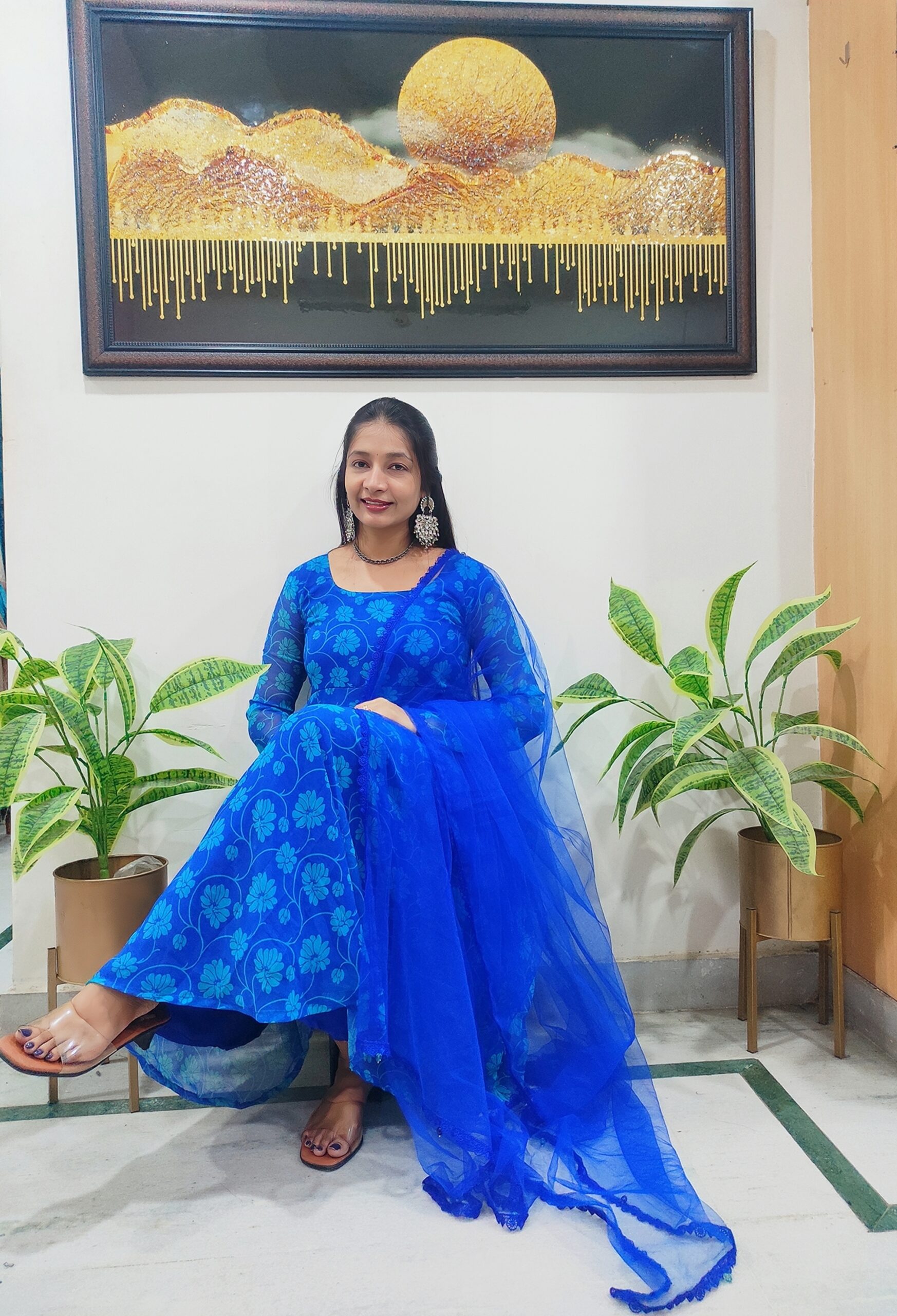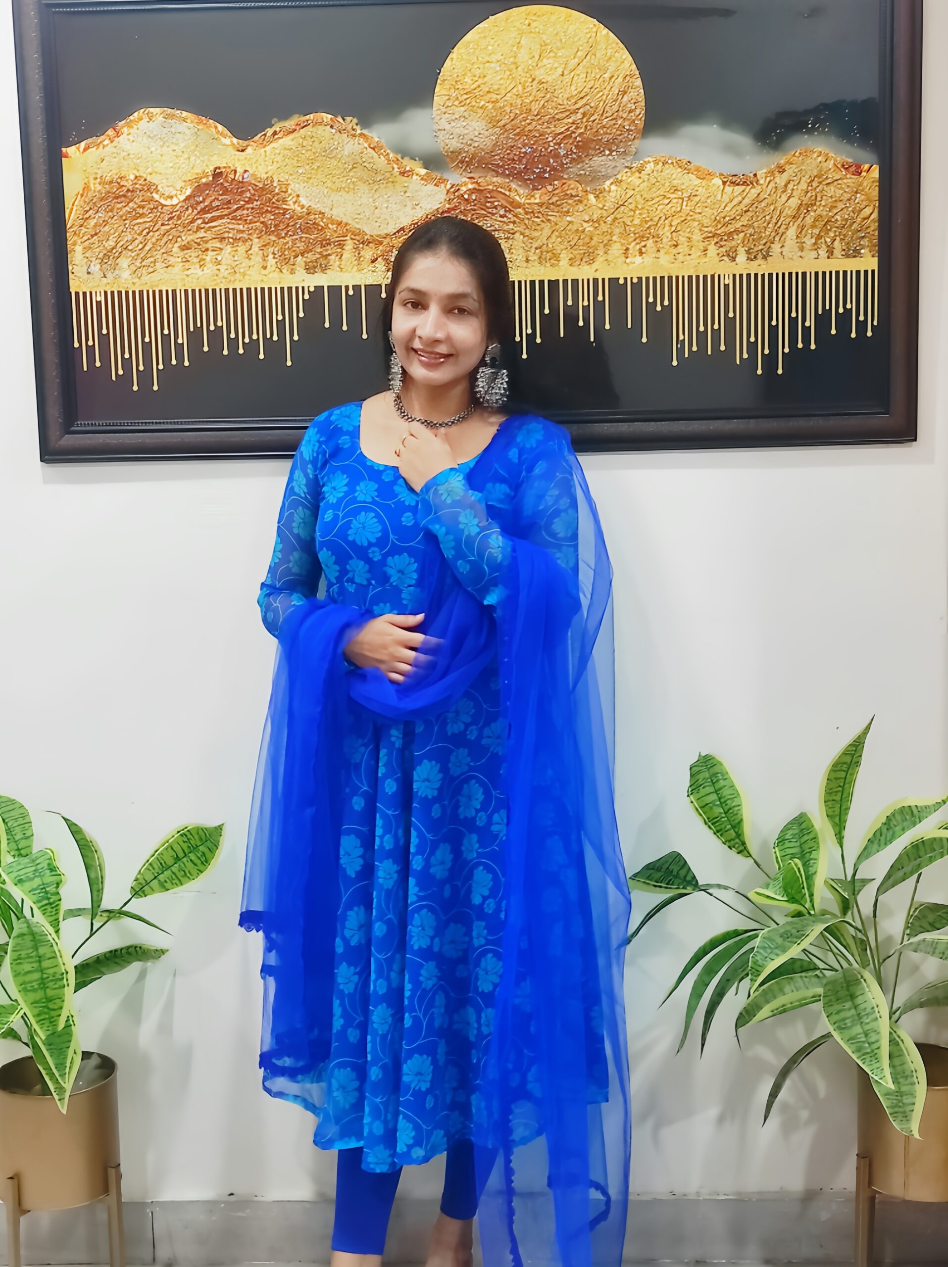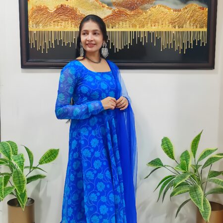 Royal Blue Georgette Printed Anarkali with full sleeves, paired with a matching net dupatta featuring lace and hand-stitched bead hangings – lightweight, elegant, and perfect for any occasion.