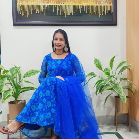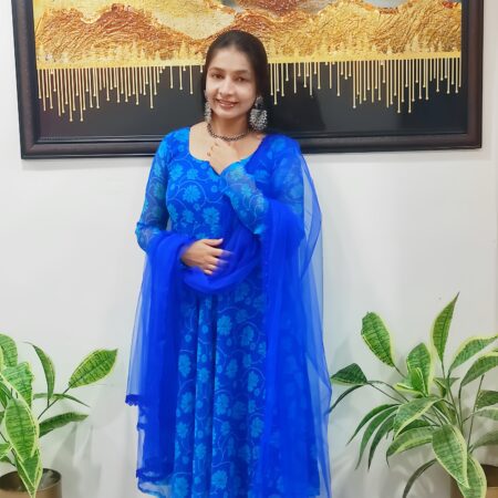 Crafted in rich royal blue georgette, this printed Anarkali features full sleeves and a flowing silhouette, paired with a delicate net dupatta adorned with lace and hand-stitched bead hangings. Lightweight and elegant, it’s perfect for festive gatherings or special occasion, Pair it with statement silver earrings and embellished juttis for a graceful, traditional look.