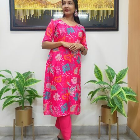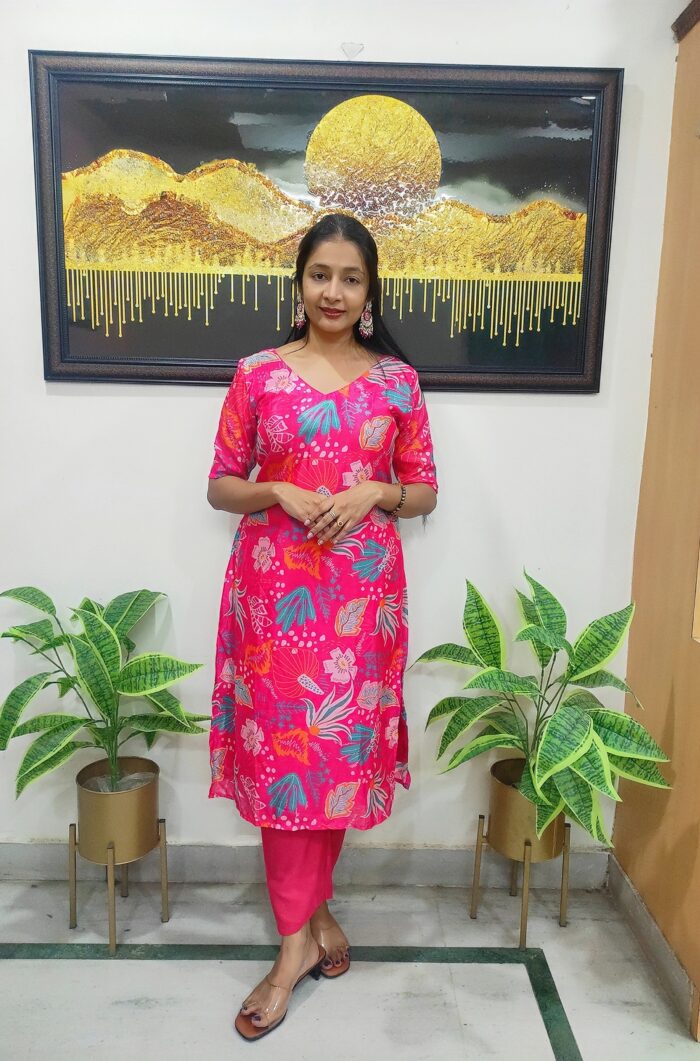 Pair the Lite Pink Multicolour Kurta Set with simple gold or pastel-toned jewelry and neutral sandals for a balanced look. Add a matching clutch and keep makeup soft with a pink lip to highlight the outfit’s freshness.