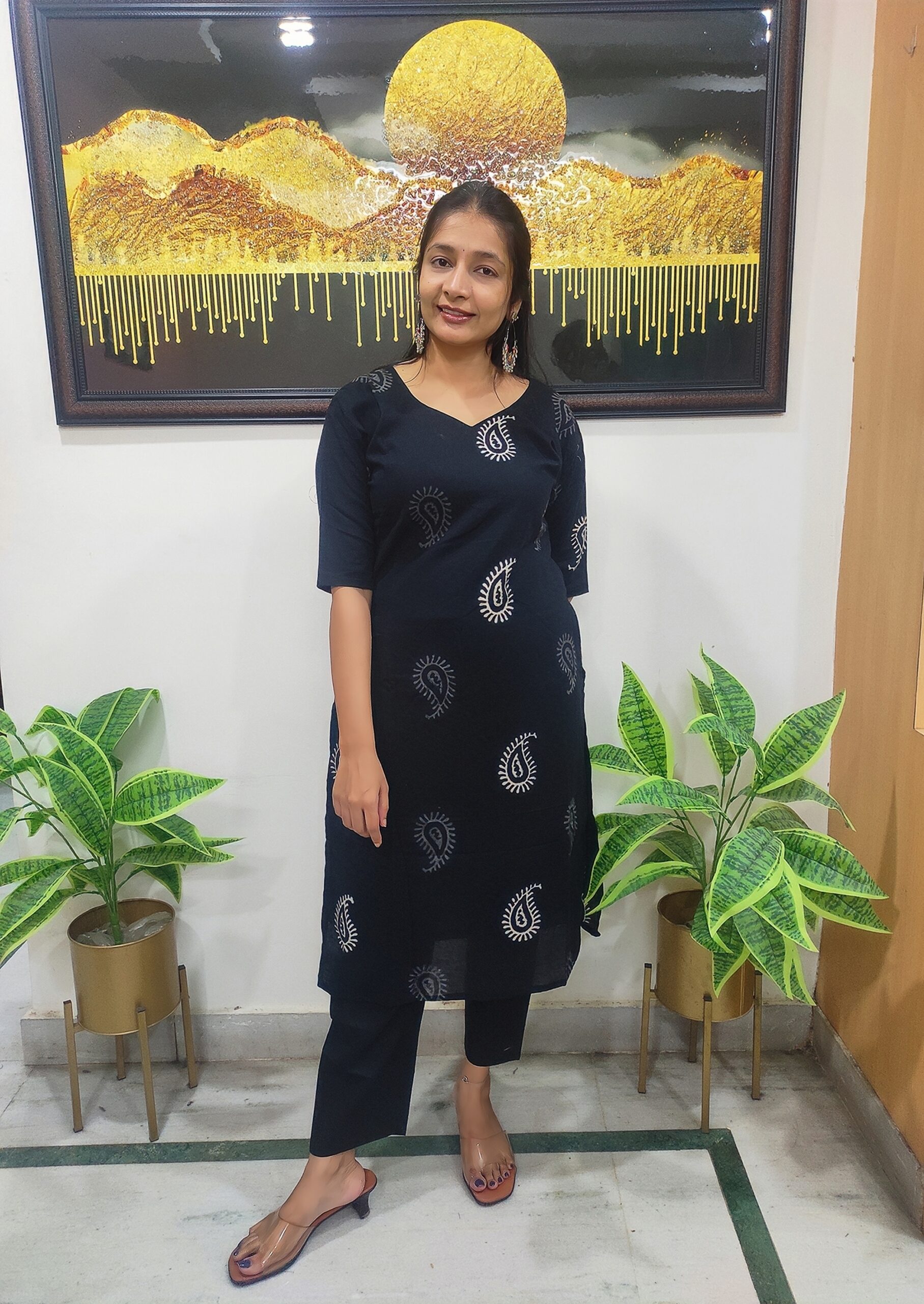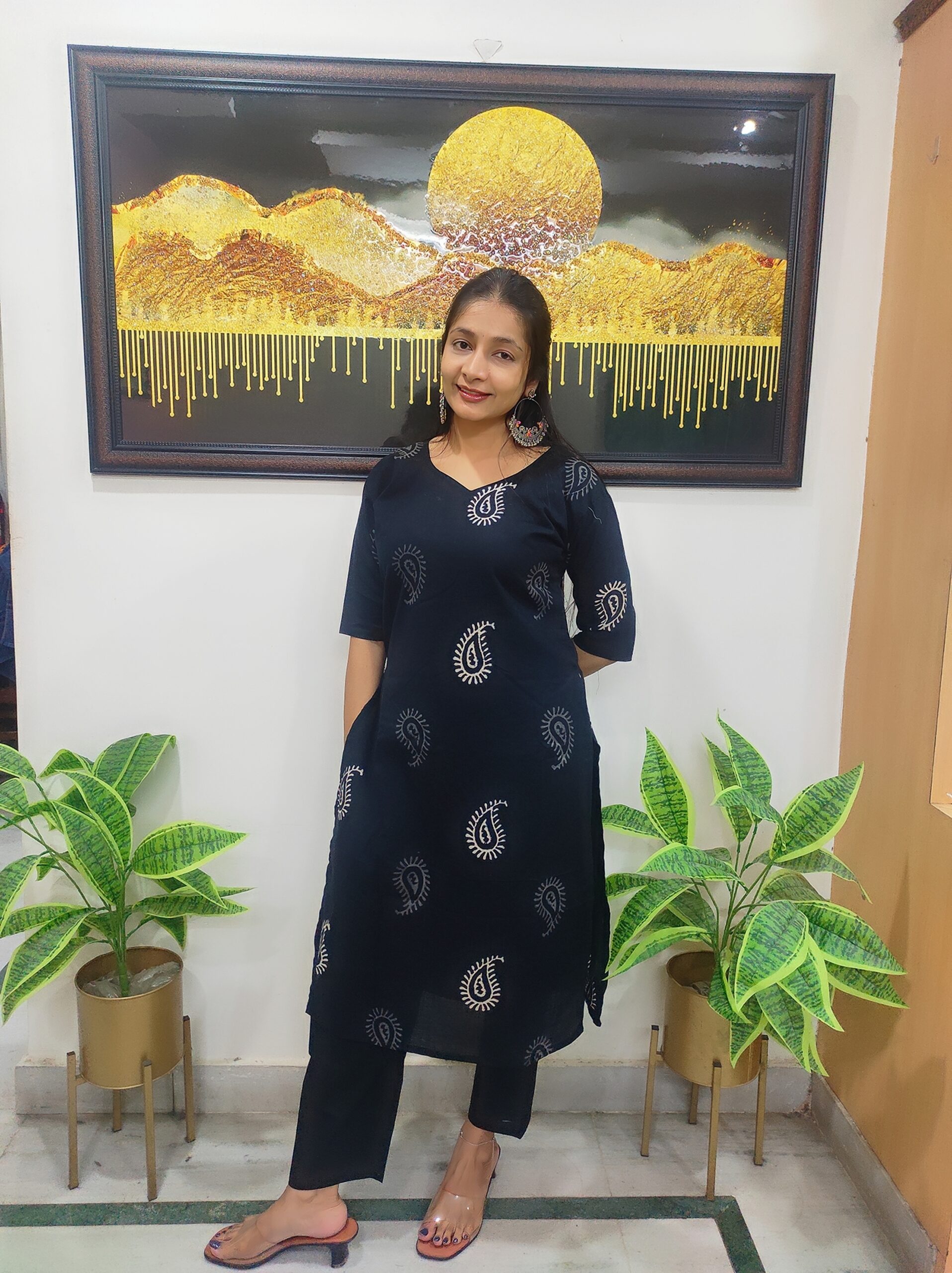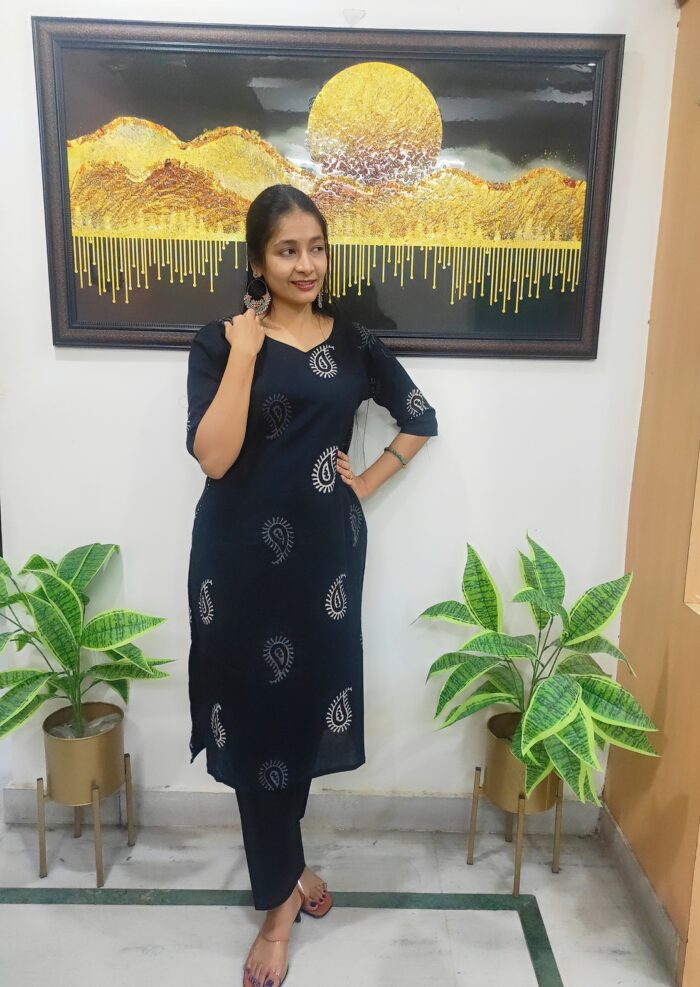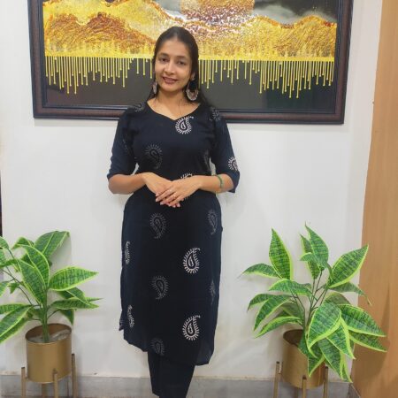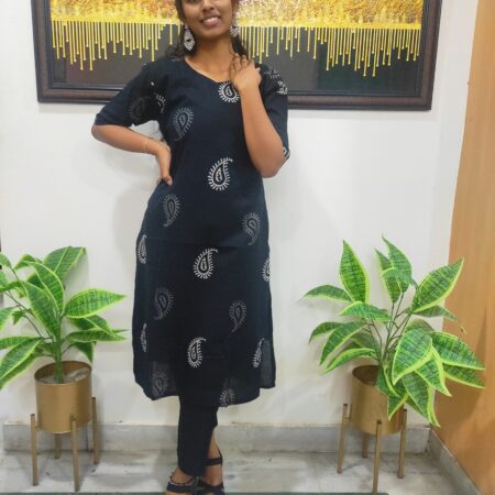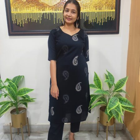 The Midnight Black Mango Print Cord Set (Kurta + Bottom) blends classic elegance with modern charm. Its rich black base and intricate mango print make it perfect for any occasion. Comfortable and stylish, it’s a timeless wardrobe essential.