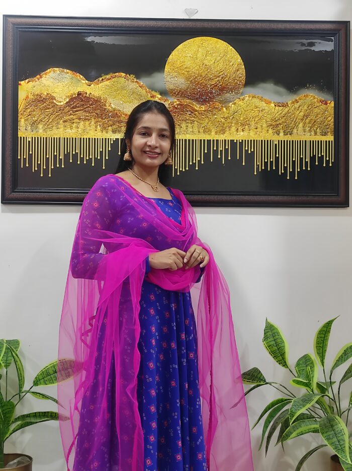 Make a statement in this purplish-blue Bandhani Anarkali with full sleeves, beautifully paired with a net dupatta detailed with lace and hand-stitched bead hangings. Perfect for festive occasions, just add gold jhumkas and heels to complete the elegant look.