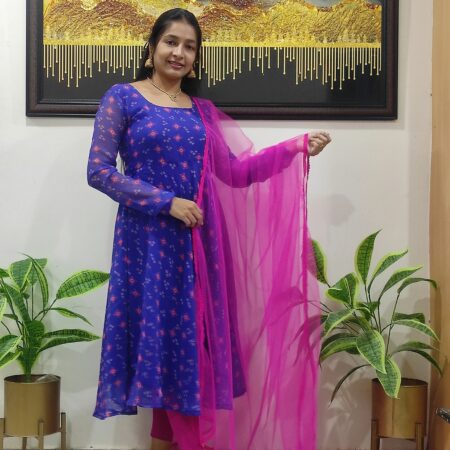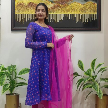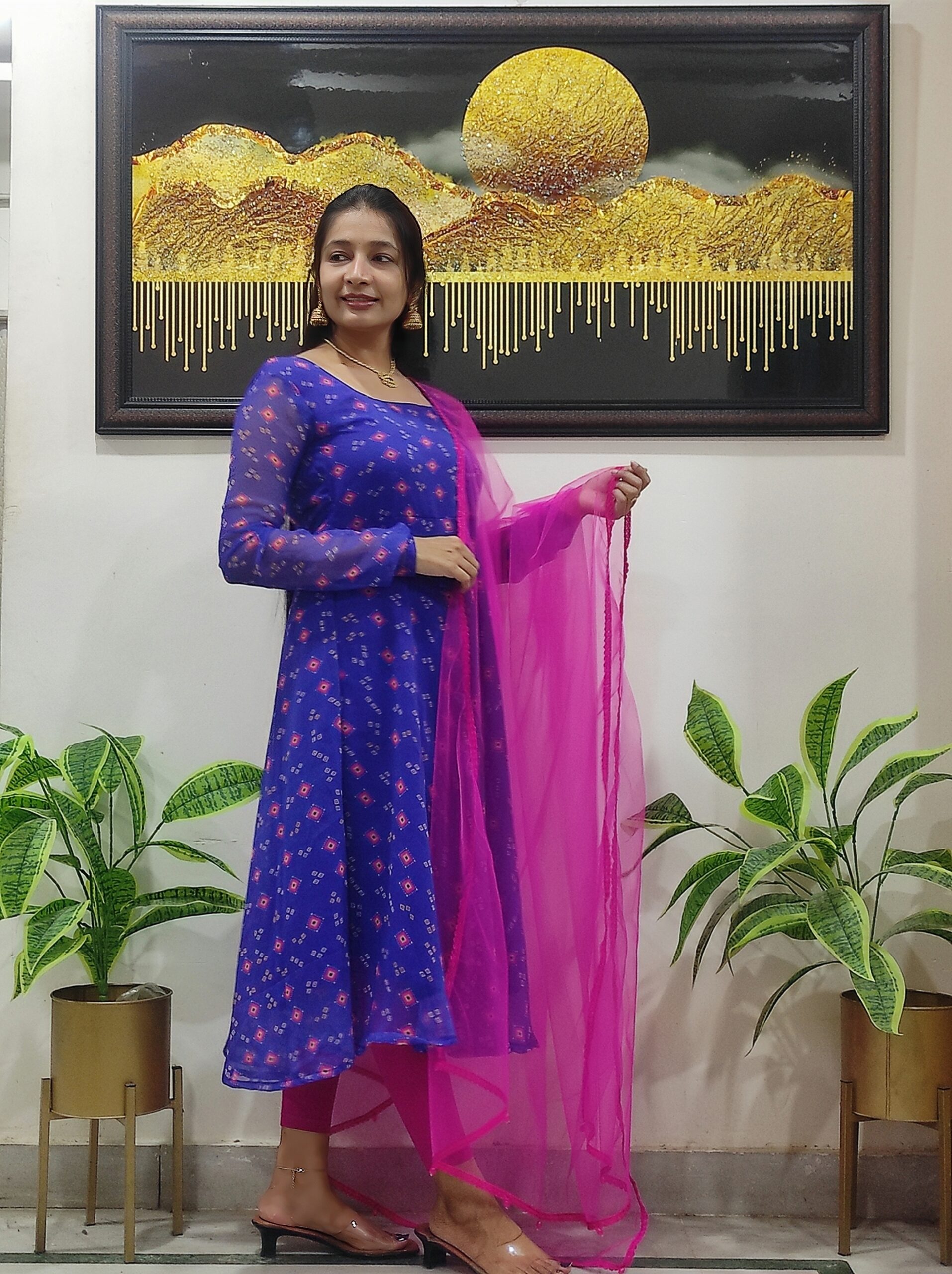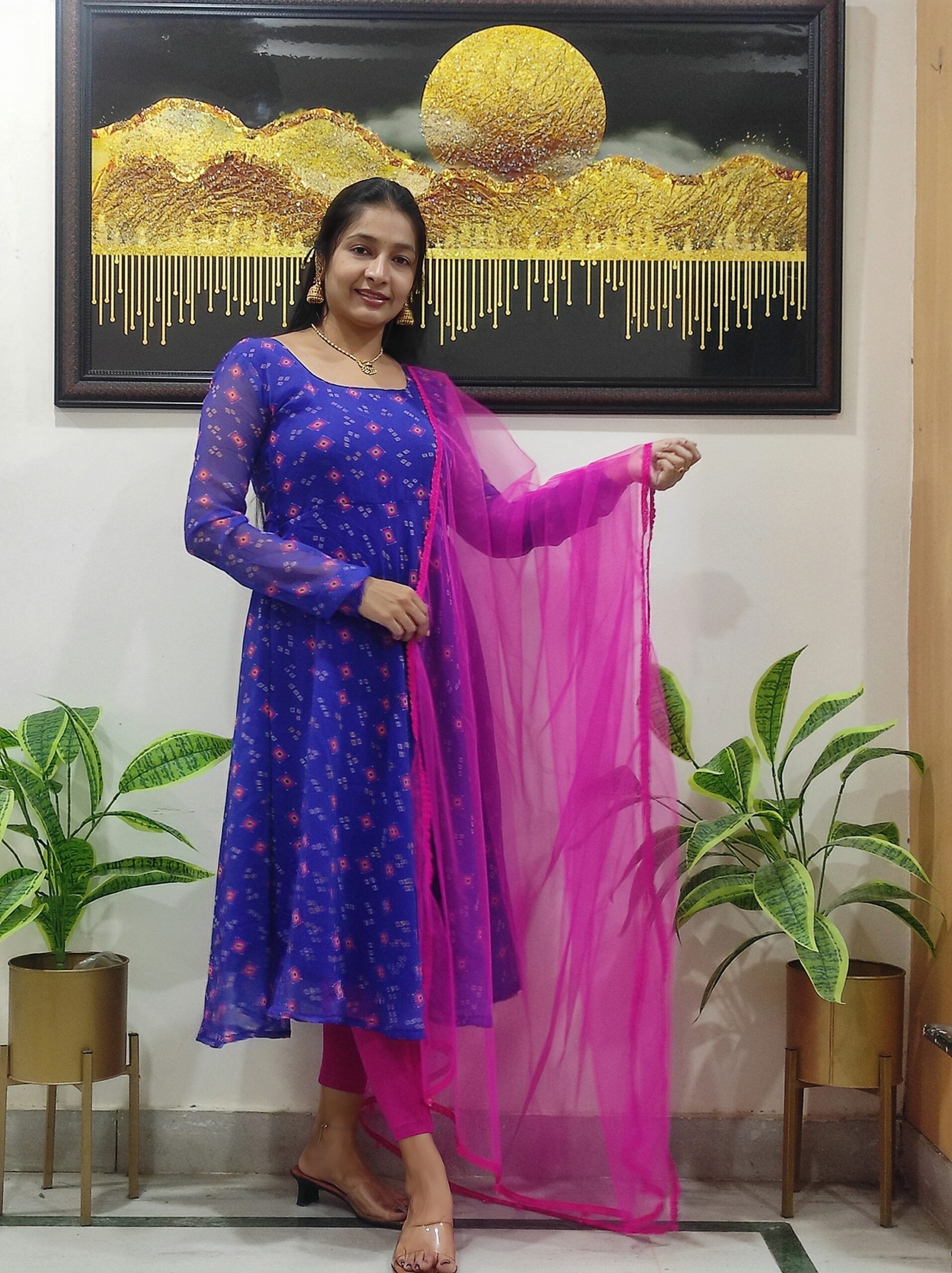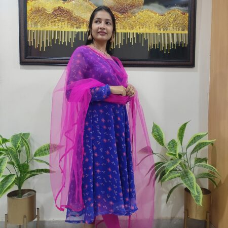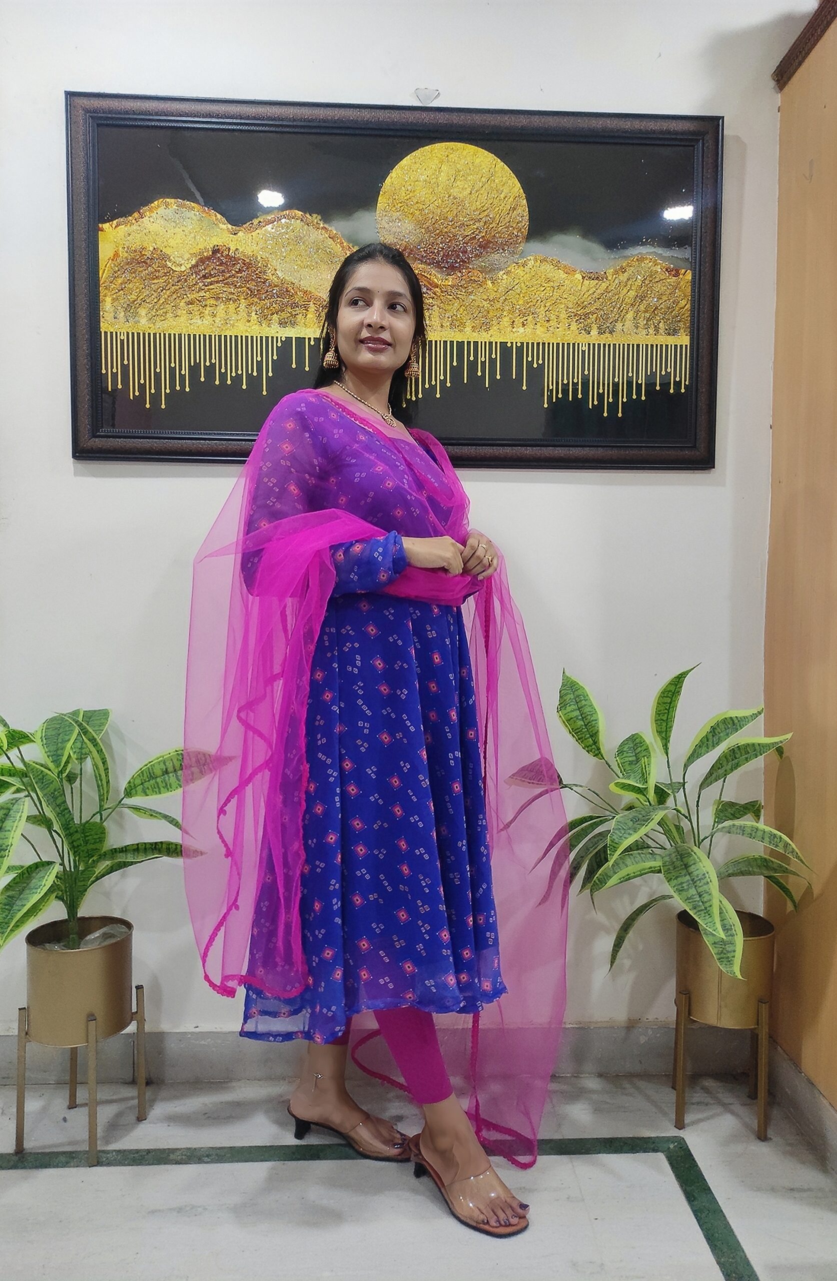 Purplish-Blue Bandhani Print Anarkali paired with a matching dupatta, adorned with lace and hand-stitched bead hangings – a vibrant fusion of tradition and elegance, perfect for festive occasions.