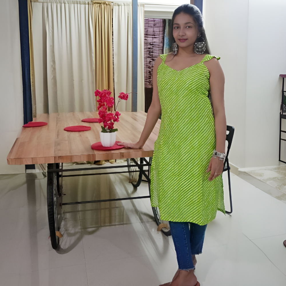 "Infuse your look with energy in a vibrant parrot green lehariya kurta—perfect for festive mornings or cultural celebrations. Pair it with straight pants. Accessorize with traditional jhumkas, colorful bangles, and embroidered juttis.