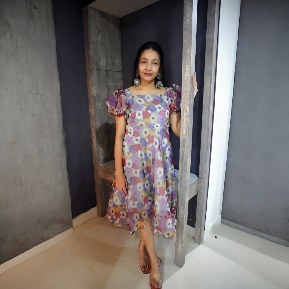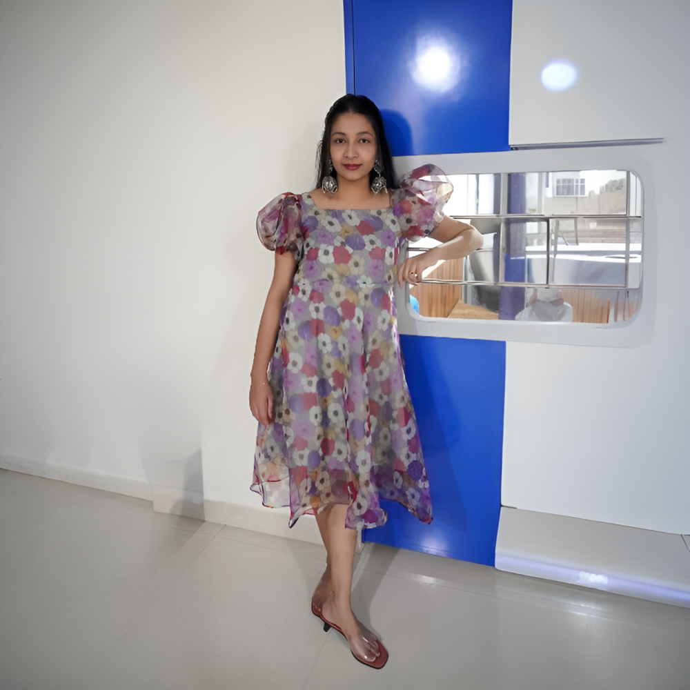 "Float through the day in the Whimsical Multicolor Organza Flared Frock—perfect for parties, brunches, or festive celebrations. Pair it with strappy metallic heels or embellished flats, dainty drop earrings, and a pastel or pearl clutch. Style your hair in soft curls or a half-updo for added romance, and finish with glowy makeup, rosy cheeks, and a glossy pink lip for a magical, fairytale-inspired look."