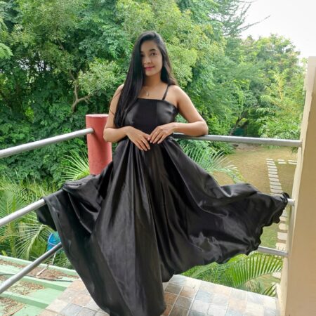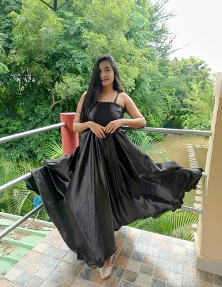 Black Satin Flowing Party Wear Frock Paired with a Velcro-Stitched Jacket.