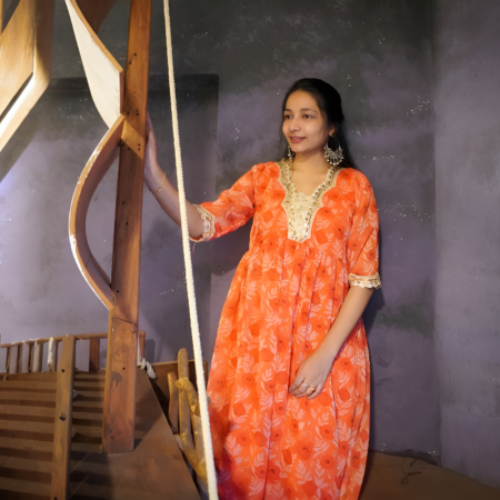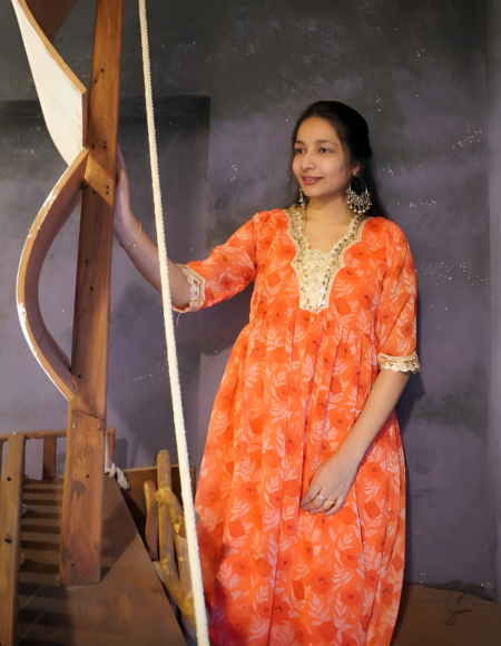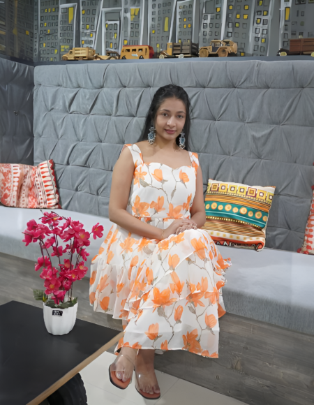 White and Orange Chiffon Crushed Floral Tiered Frock