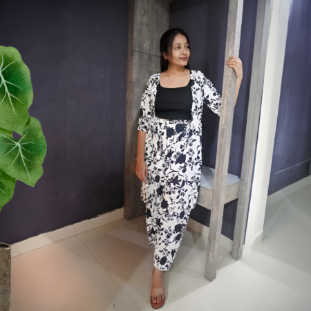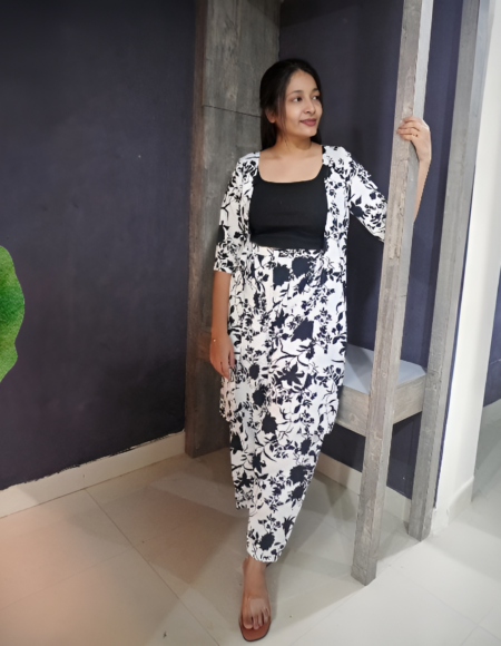 Black and white crepe printed shrug and pant set