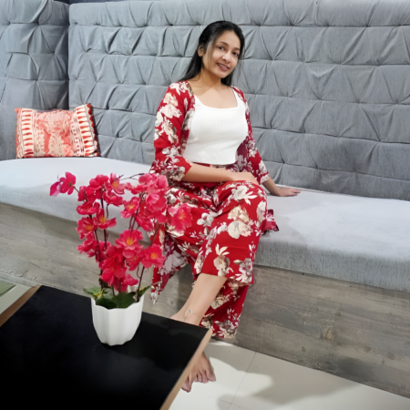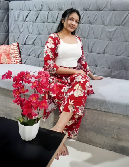 Rayon Red and White Printed Shrug and Pant Set