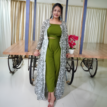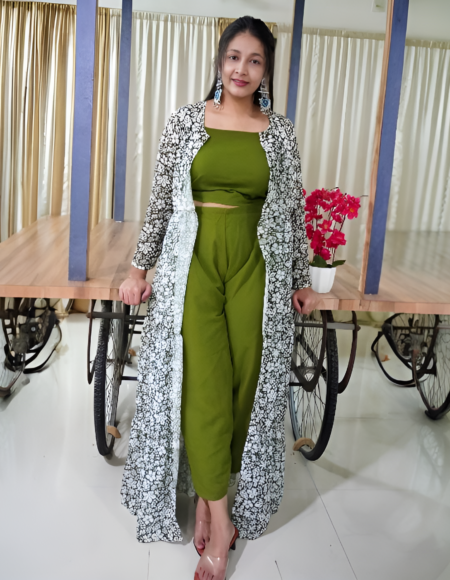 Mehandi Green Crop Top Set with Flowing Frilled Shrug